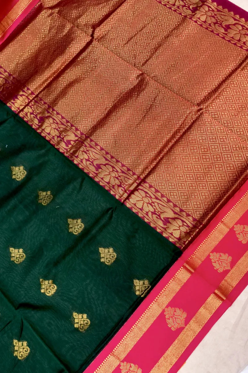 - Saree Details : Saree Fabric :-Siko Silk | Blouse Fabric :- Siko Silk | Saree Work :- Booti Design With Zari Hand Work & Golden Zari Border | Blouse Work: Wine Color Contrast Pink Border & Zari Hand Work | Saree Color: Bottle Green Color | Blouse Color : Wine Color Contrast Pink Border |