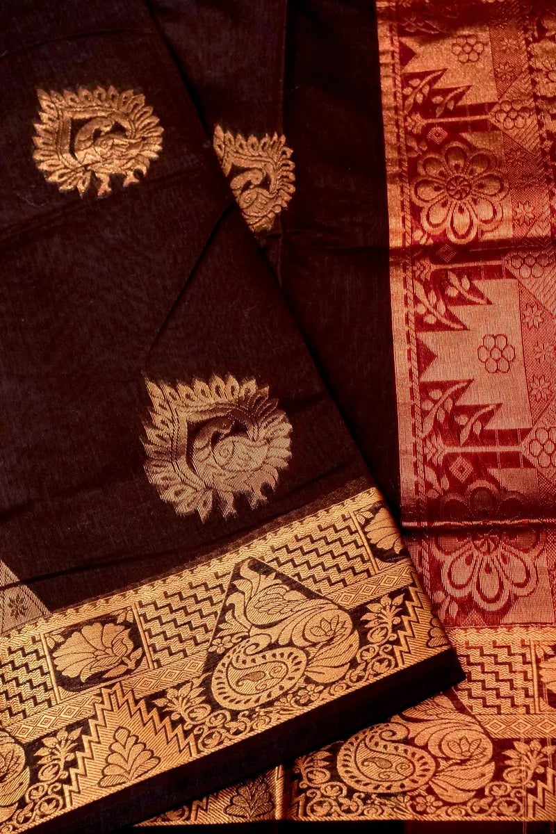 - Saree Details : Saree Fabric :- Siko Cotton | Blouse Fabric :- Siko Cotton | Saree Work :- Chanderi Boota Design With Zari Handwork & Golden Zari Border | Blouse Work: Maroon Color Contrast Blouse With Zari Border | Saree Color: Chocolate Brown Color | Blouse Color : Maroon Color Contrast Blouse |