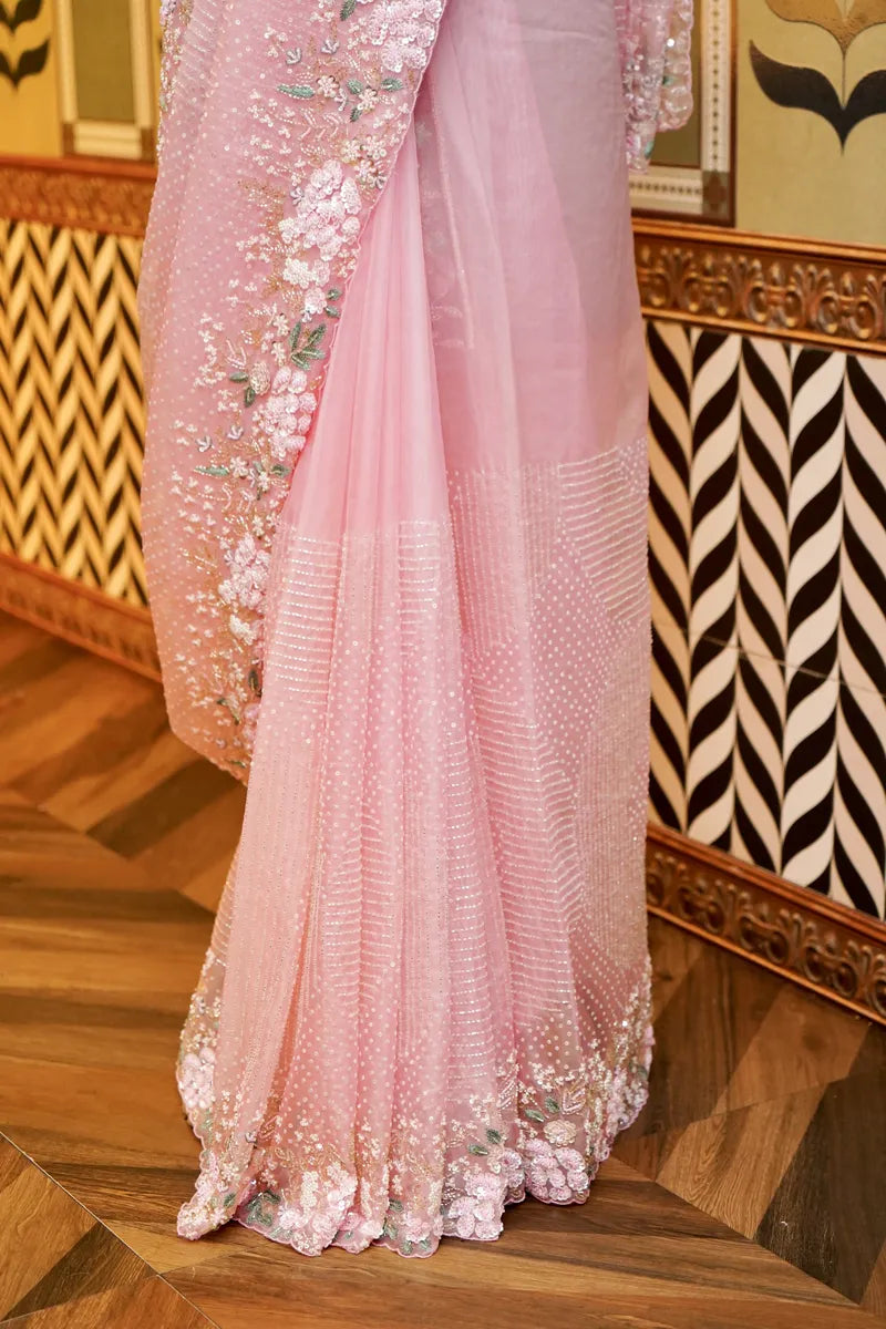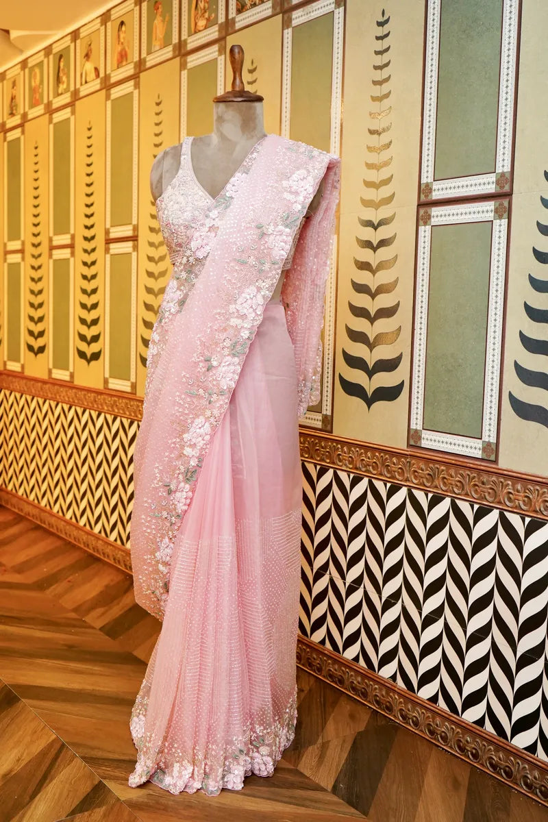 Saree Details: Saree Fabric:- Pure Organza | Blouse Fabric:- Pure Organza | Saree Work:- Cutdana Work With All Over Tikki Sequence Hand Work | Blouse Work:- Baby Pink Color With Cutdana Tikki Sequence Work | Saree Color:- Baby Pink | Blouse Color:- Baby Pink Color |