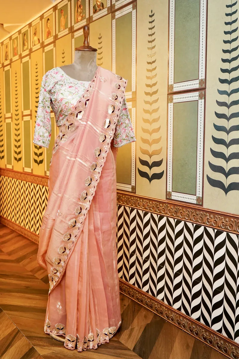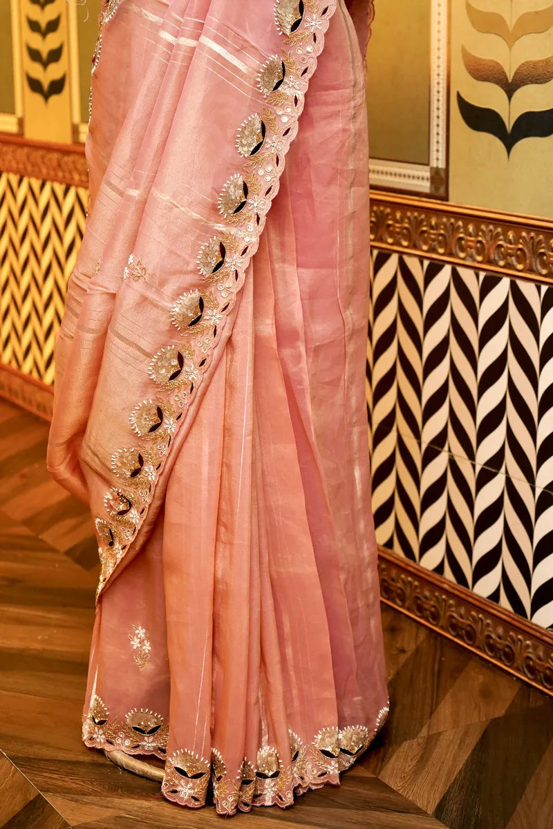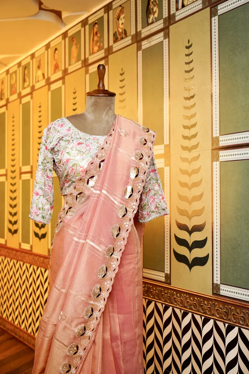 Saree Details: Saree Fabric:- Kora Silk | Blouse Fabric:- Kora Silk | Saree Work:- Zardosi Work With Gota Patti Handwork | Blouse Work:- Pink Color With Zardosi Gota Patti Work | Saree Color:- Baby Pink | Blouse Color:- Pink Color |