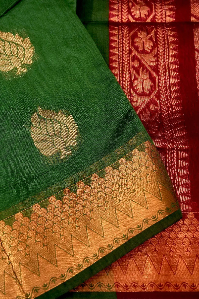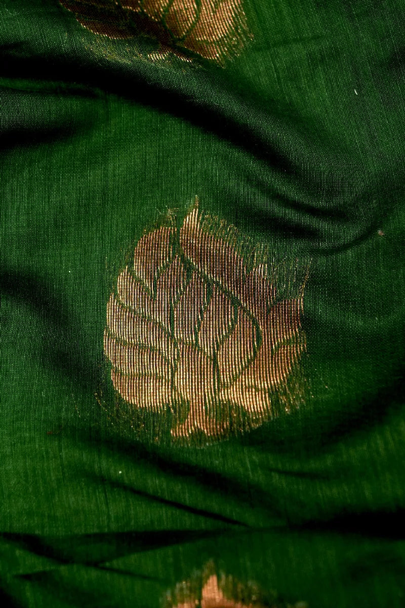 - Saree Details : Saree Fabric :- Siko Cotton | Blouse Fabric :- Siko Cotton | Saree Work :- Boota Zari Design With Zari Hand Work & Golden Zari Border | Blouse Work: Maroon Color With Zari Border | Saree Color: Mehendi Green Color | Blouse Color : Maroon Color |