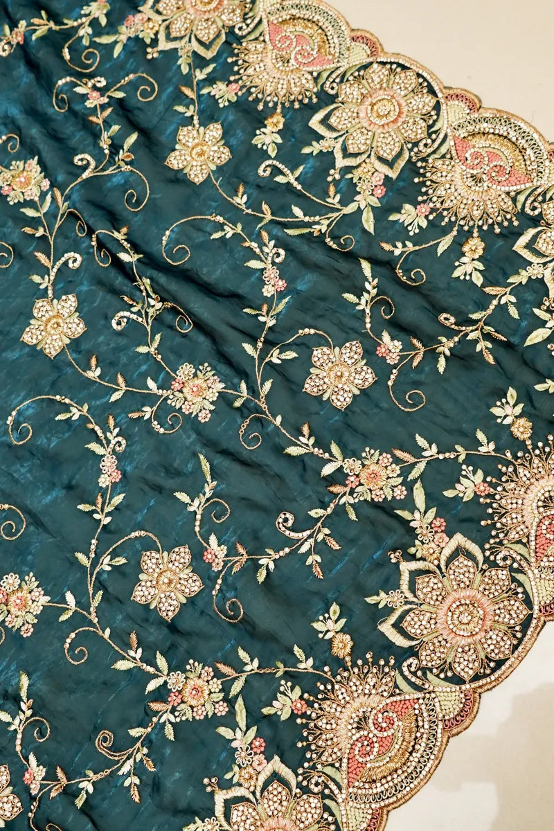Saree Details: Saree Fabric: Pure Crepe | Blouse Fabric: Pure Crepe | Saree Work: Resham Zari Work With All Over Jaal & Stone Zari Hand Work | Blouse Work: Rama Green Color With Resham Zari Work | Saree Color: Rama Green Color | Blouse Color: Rama Green Color |