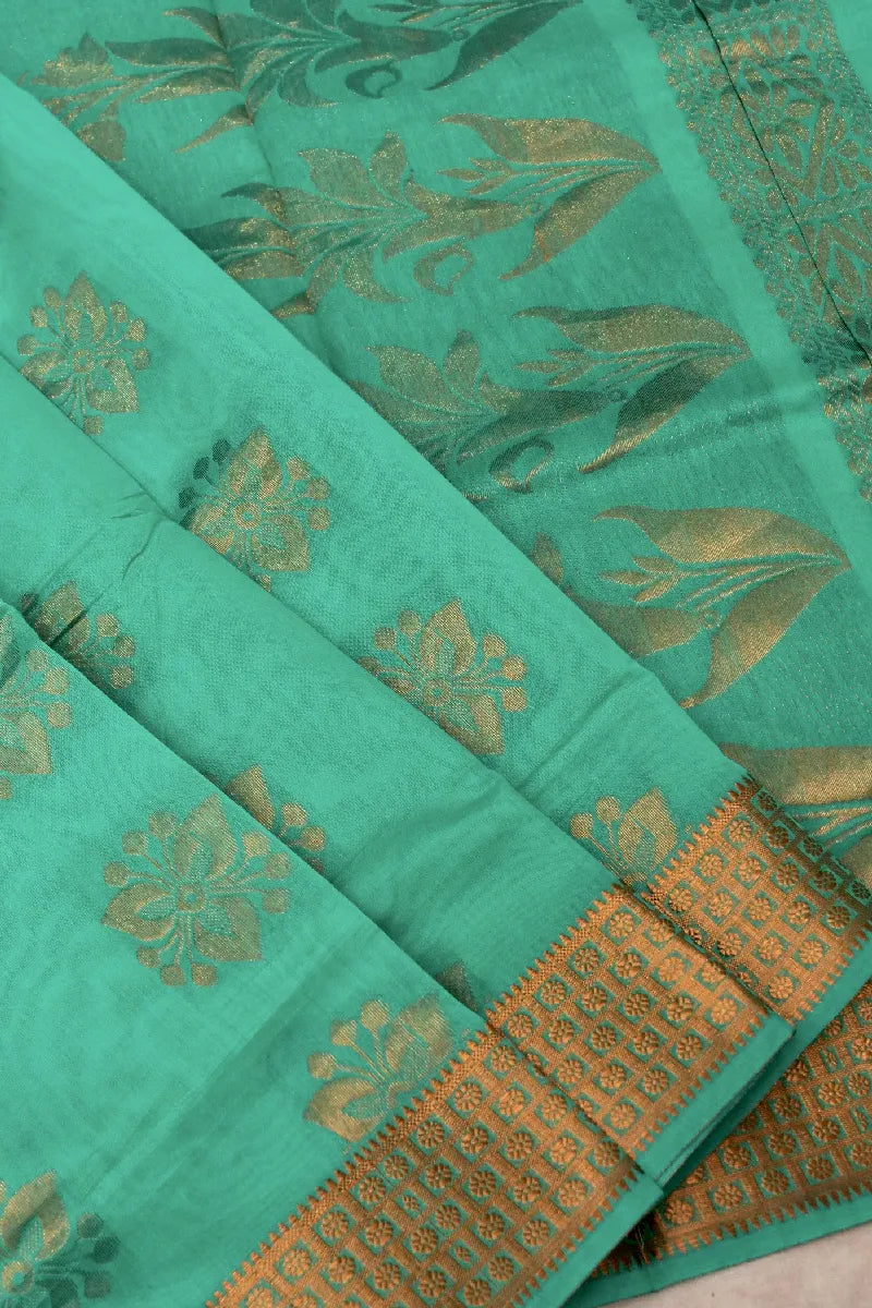 - Saree Details : Saree Fabric :- Siko Cotton | Blouse Fabric :- Siko Cotton | Saree Work :- Boota Zari Design With Zari Hand Work & Golden Zari Border | Blouse Work: Rama Green Color With Golden Zari Border | Saree Color: Rama Green Color | Blouse Color : Rama Green Color |