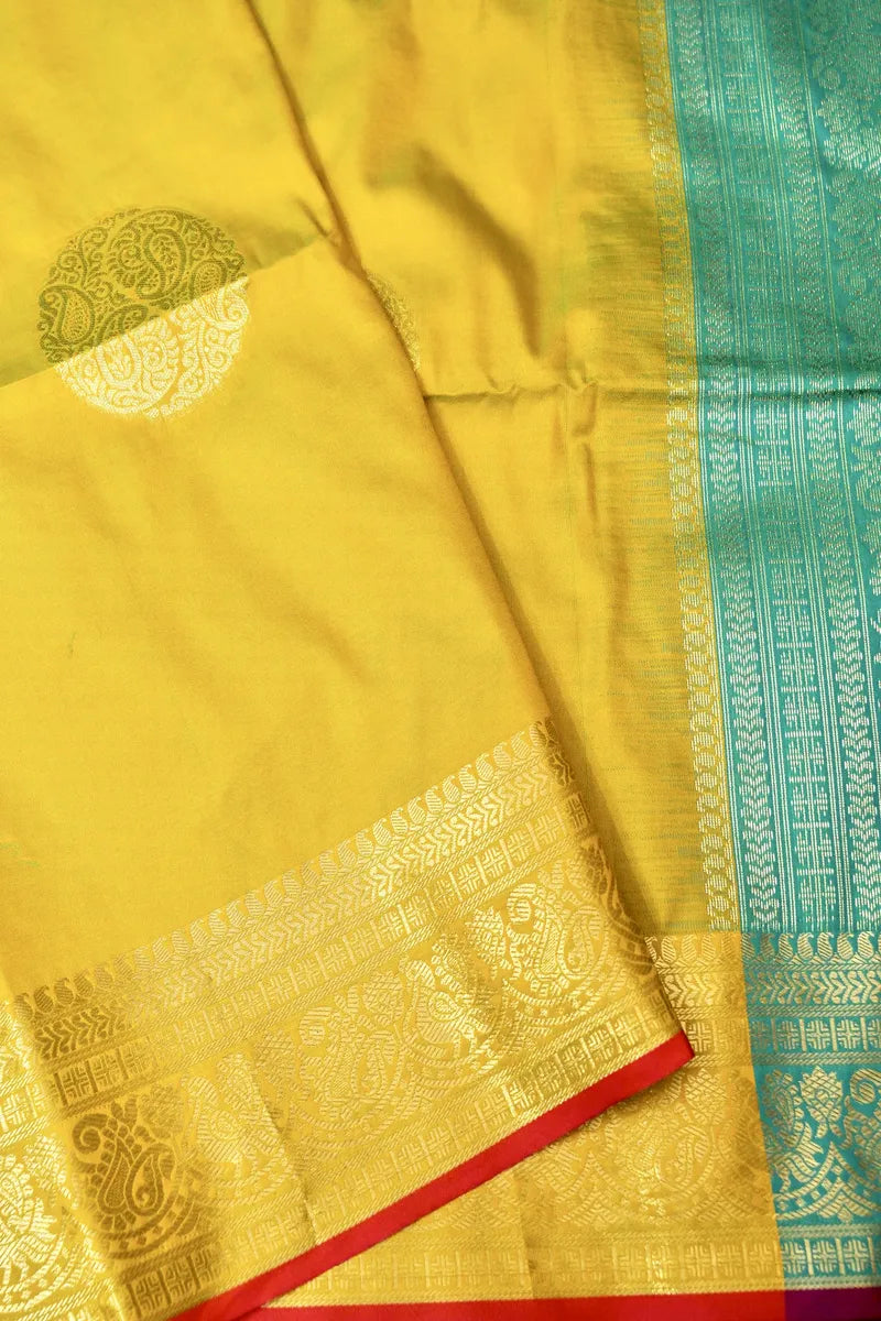 Saree Details : Saree Fabric: Banarasi Satin Silk | Blouse Fabric: Banarasi Satin Silk | Saree Work: Golden Zari Boota Border & Anchal | Blouse Work: Plain Golden Zari Border | Saree Color: Lemon With Rama Green Anchal | Blouse Color: Rama Green |