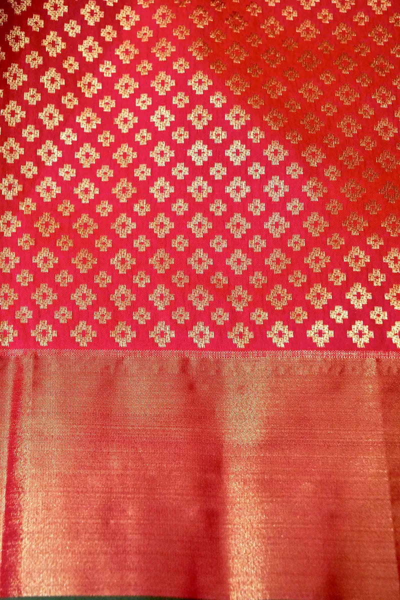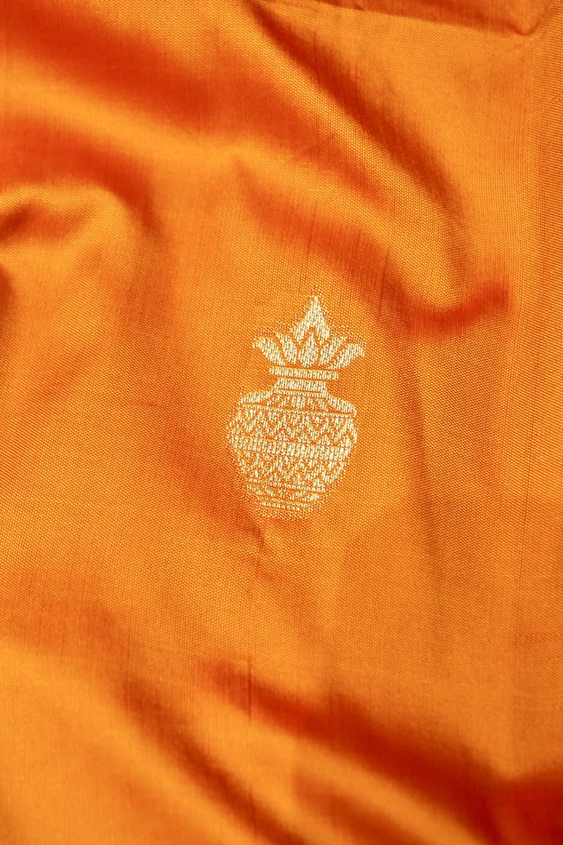 - Saree Details : Saree Fabric: Banarasi Satin Silk | Blouse Fabric: Banarasi Satin Silk | Saree Work: Golden Zari Booti Border & Anchal | Blouse Work: Plain Golden Zari Border | Saree Color: Mustard Yellow With Pink Anchal | Blouse Color: Pink |