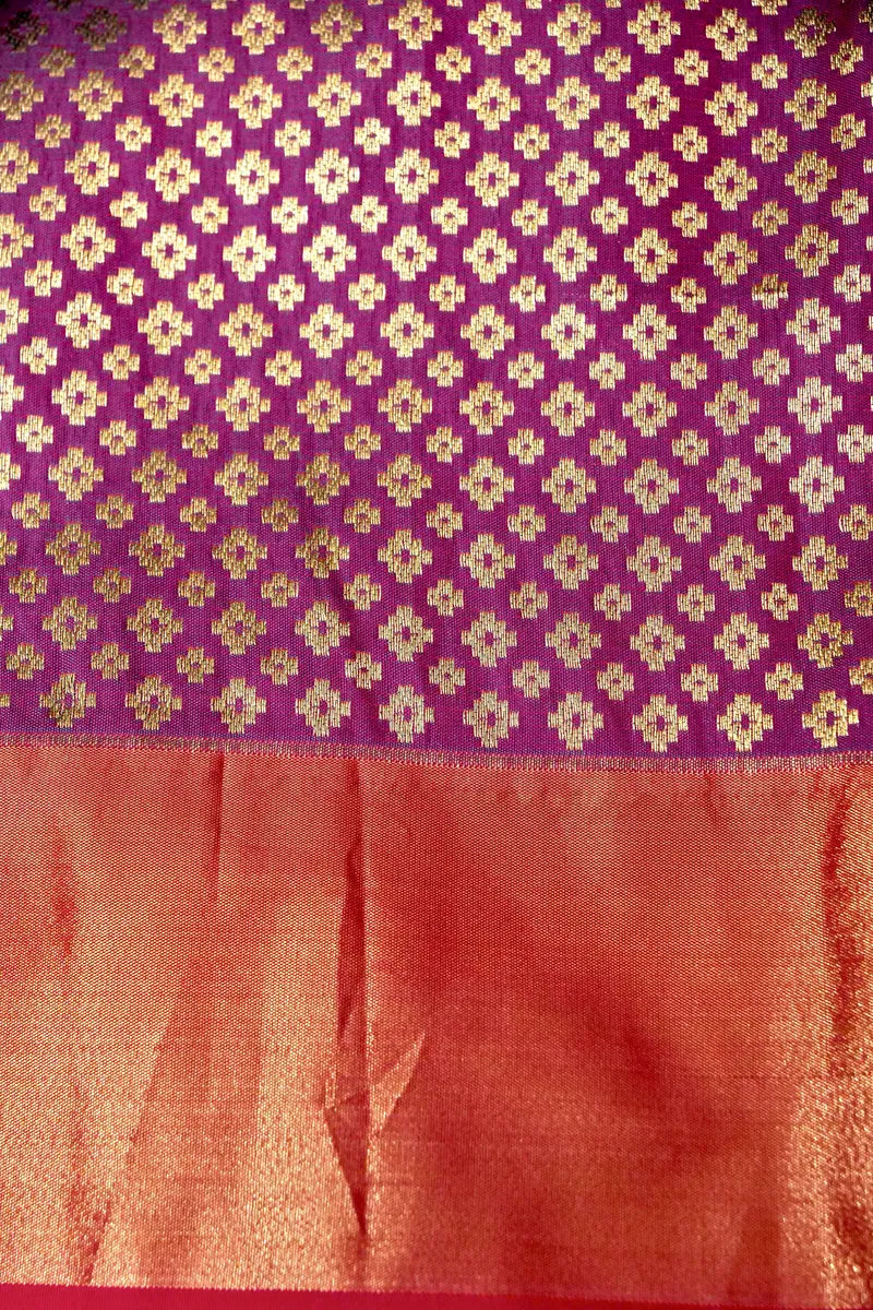 Saree Details : Saree Fabric: Banarasi Satin Silk | Blouse Fabric: Banarasi Satin Silk | Saree Work: Golden Zari Booti Border & Anchal | Blouse Work: Plain Golden Zari Border | Saree Color: Rama Green With Purple Anchal | Blouse Color: Purple |