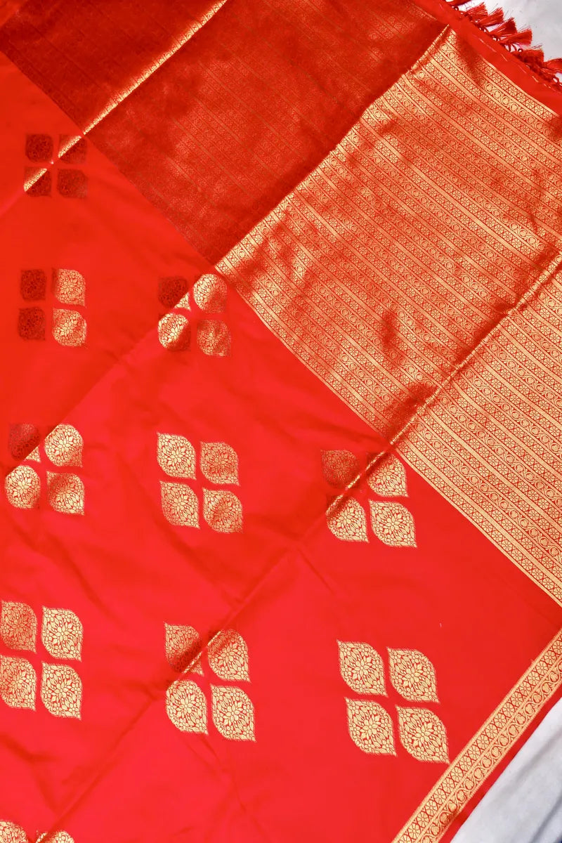 - Saree Details: Saree Fabric: Banarasi Satin Silk | Blouse Fabric: Banarasi Satin Silk | Saree Work: Golden Zari Boota Border & Anchal | Blouse Work: Brocket Golden Zari Border | Saree Color: Red | Blouse Color: Red |