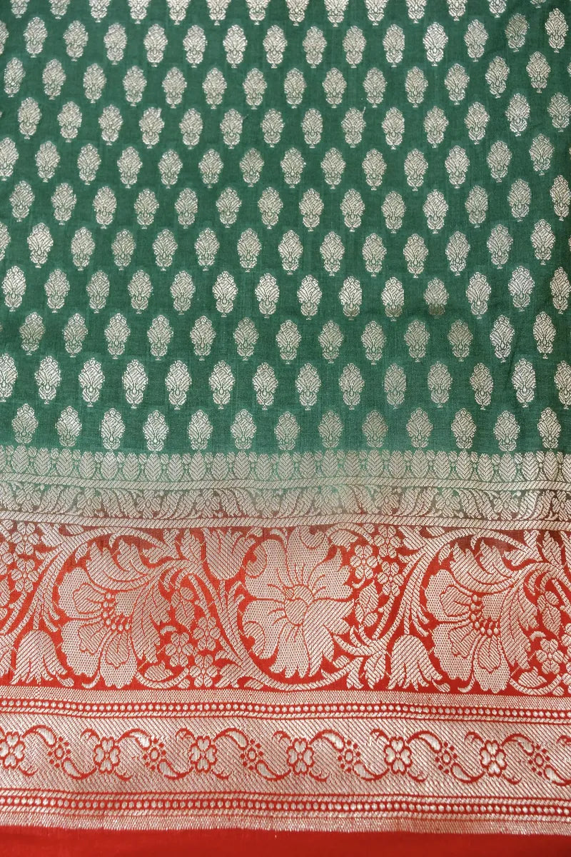 Top Fabric : Banarasi Semi Silk | Top Length : 2.5 Mtr | Top Color : Bottle Green With Red Border | Top Work : Golden Zari Booti With Border