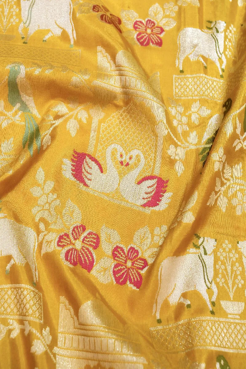 - Saree Details : Saree Fabric :- Banarasi Single Katan Rich Zari | Blouse Fabric :- Banarasi Single Katan Rich Zari | Saree Work :- Figure Concept Golden Zari With Multi Resham Handwork | Blouse Work :- Golden Zari Border| Saree Color:-Yellow | Blouse Color :- Yellow Color |