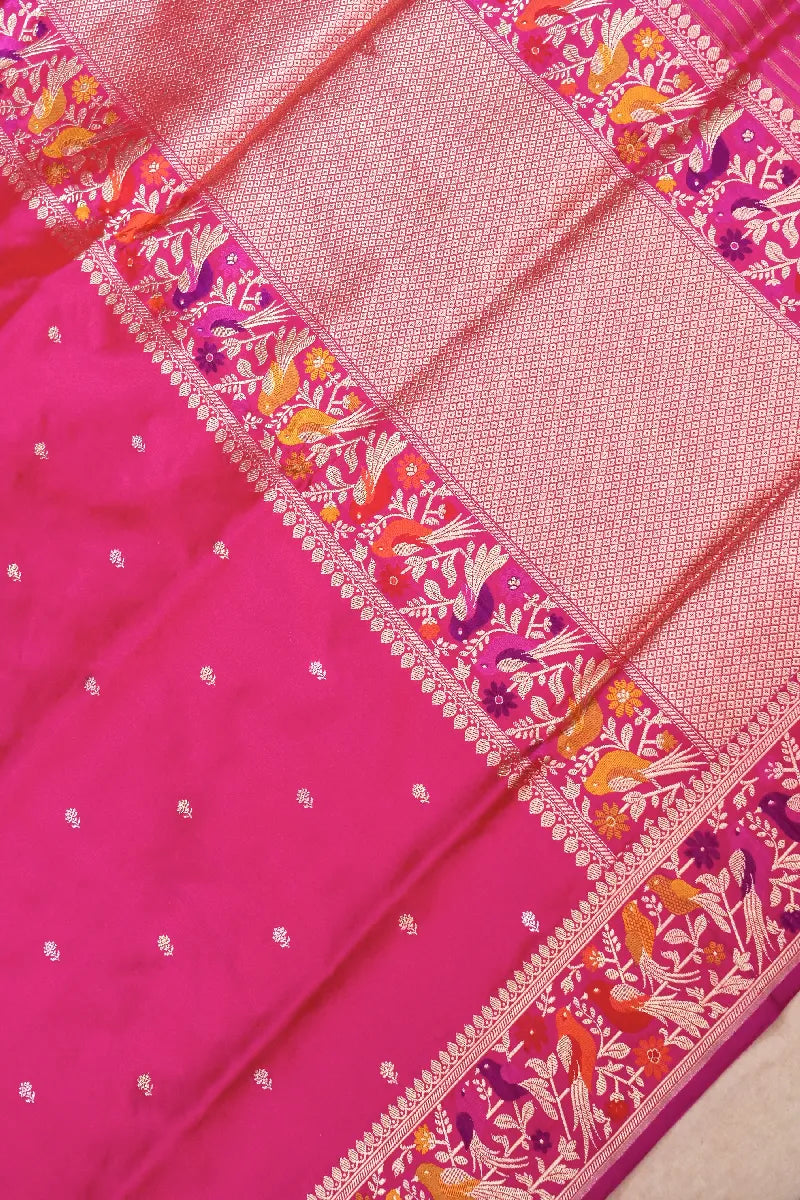 - Saree Details : Saree Fabric :- Banarasi Single Katan Rich Zari | Blouse Fabric :- Banarasi Single Katan Rich Zari | Saree Work :- All Over Booti Figure Concept Golden Zari With Multi Resham Handwork Border | Blouse Work :- Golden Zari Multi Color Resham With Madhubani Border| Saree Color:-Rani Color | Blouse Color :- Rani Color |