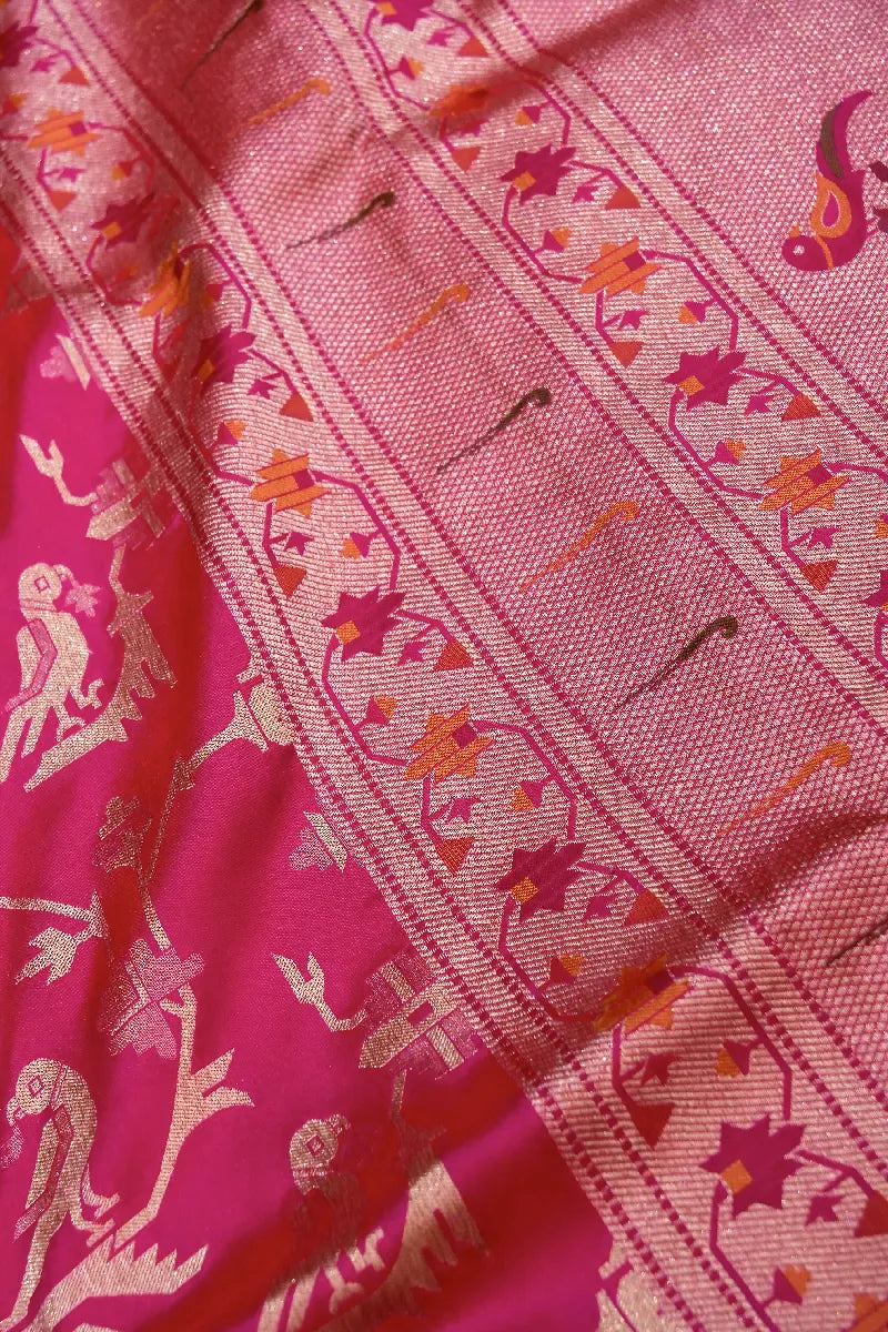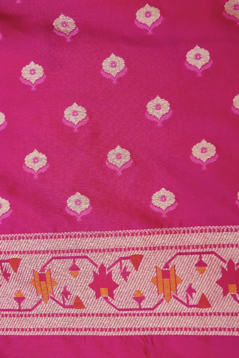 Saree Details : Saree Fabric :- Banarasi Single Katan Rich Zari | Blouse Fabric :- Banarasi Single Katan Rich Zari | Saree Work :- All Over Figure Concept Golden Zari With Multi Resham Handwork | Blouse Work :- All Over Booti Golden Resham Zari Border| Saree Color:-Rani Color | Blouse Color :- Rani Color |