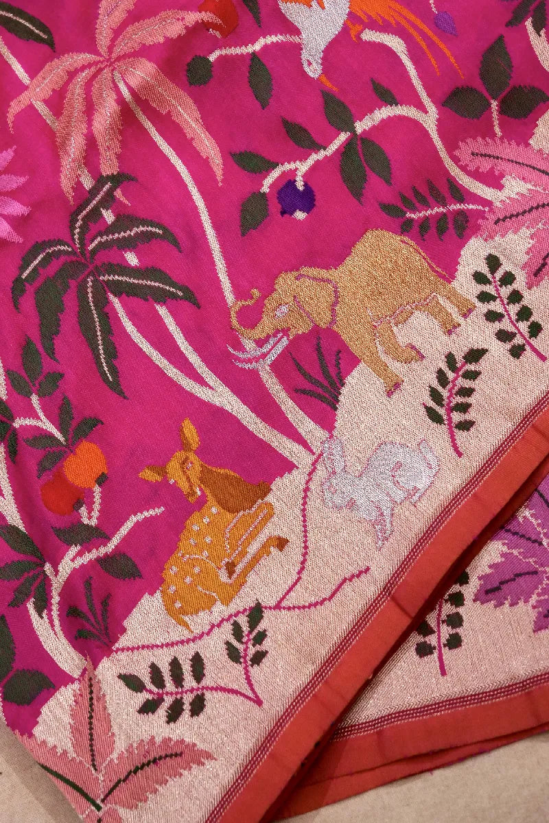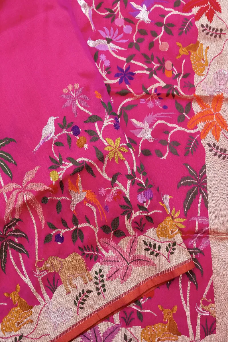 Saree Details : Saree Fabric :- Banarasi Single Katan Rich Zari | Blouse Fabric :- Banarasi Single Katan Rich Zari | Saree Work :- Skirt Pattern Madhubani Figure Concept Multi Resham With Golden Zari Handwork | Blouse Work :- Golden Zari Border| Saree Color:- Rani Color | Blouse Color :- Rani Color