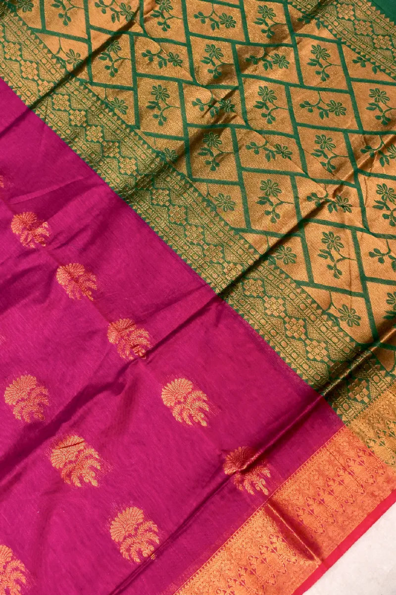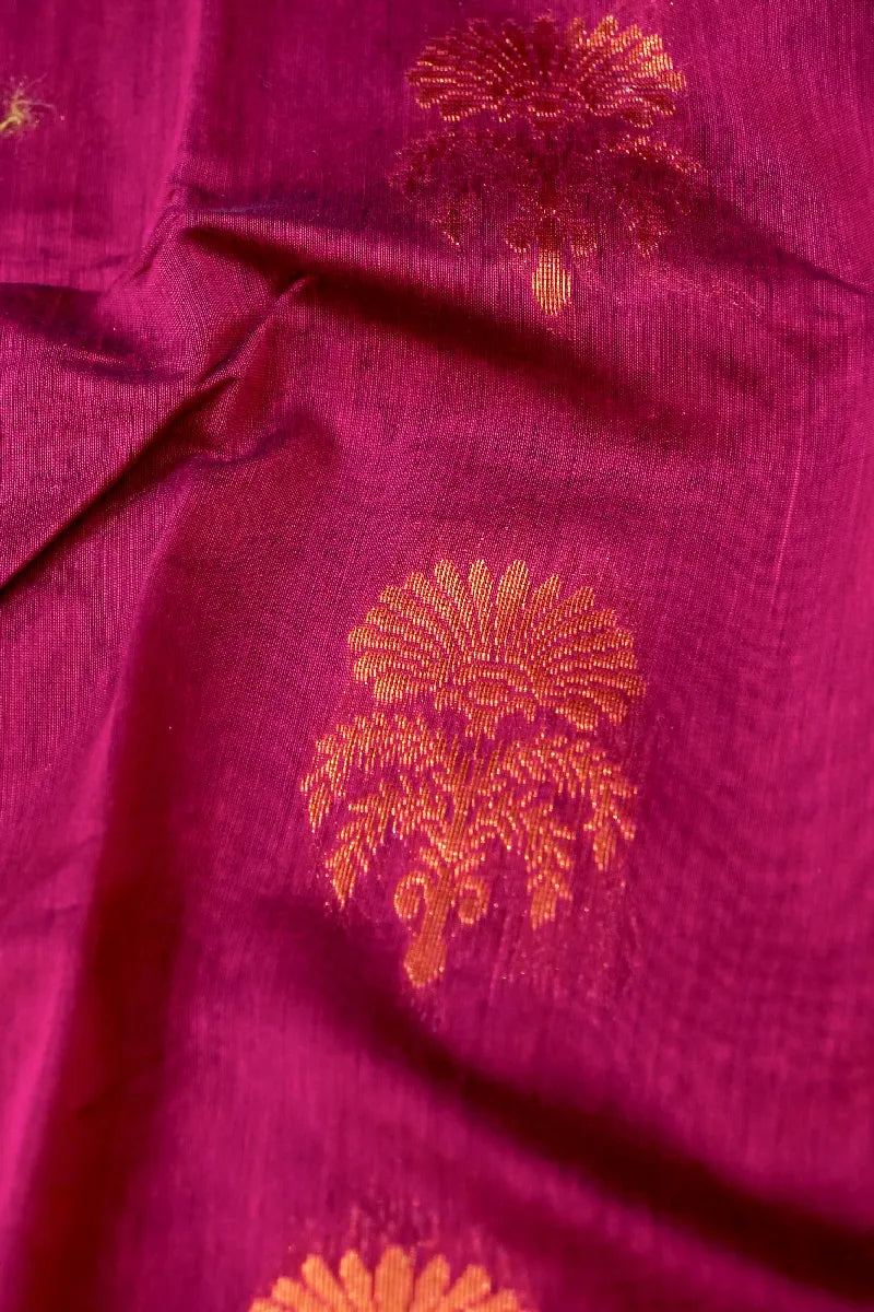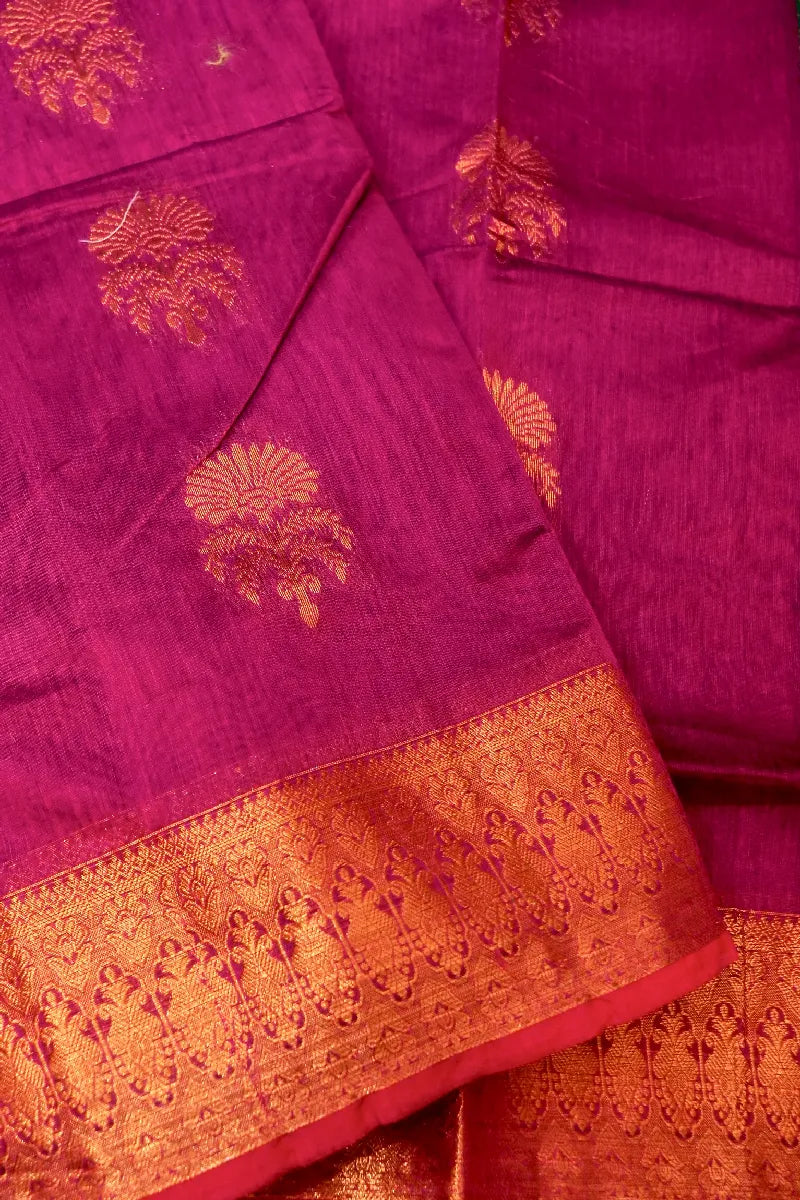 - Saree Details : Saree Fabric :- Siko Cotton | Blouse Fabric :- Siko Cotton | Saree Work :- Boota Design With Zari Hand Work & Golden Zari Border | Blouse Work: Bottle Green Color With Brocket Blouse & Golden Zari Border | Saree Color: Wine Color | Blouse Color: Bottle Green Color |