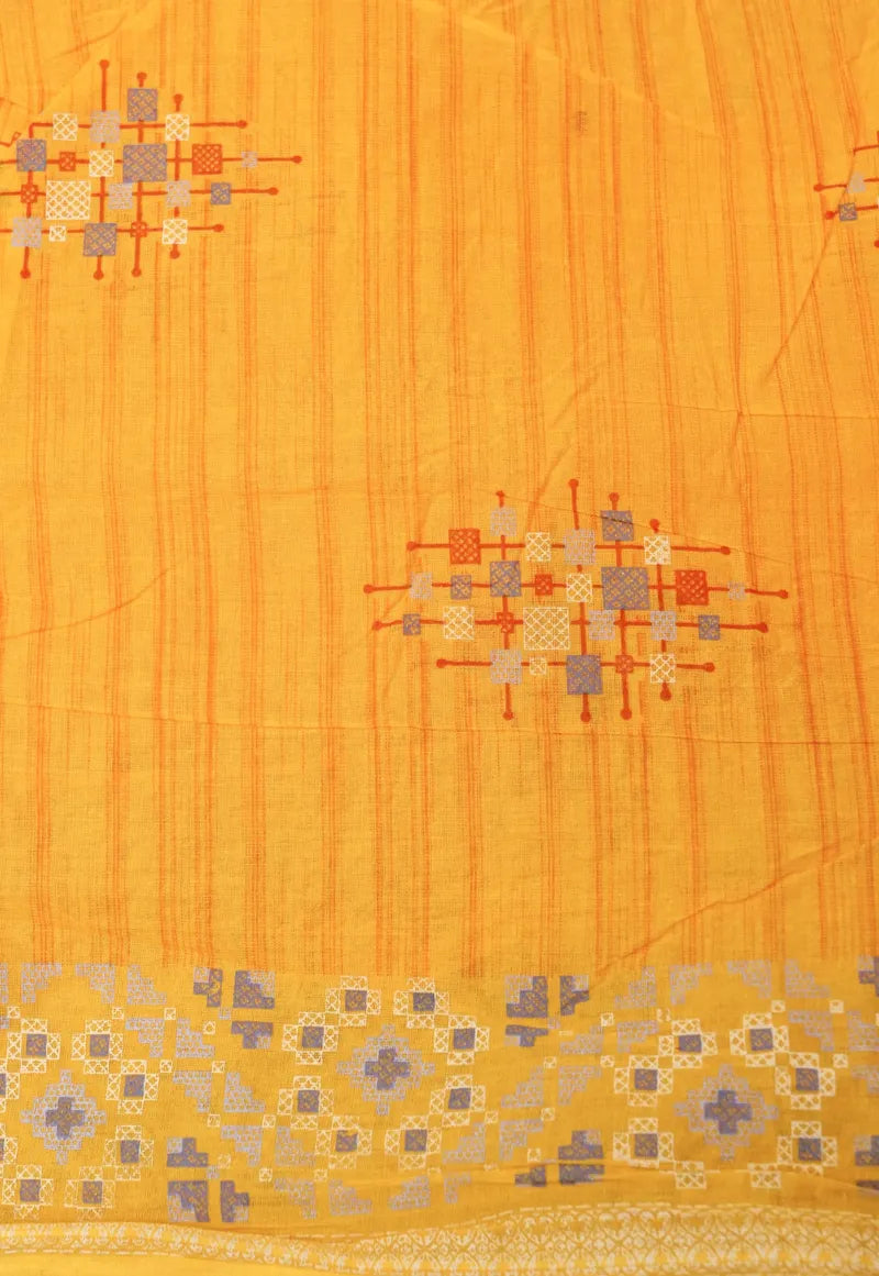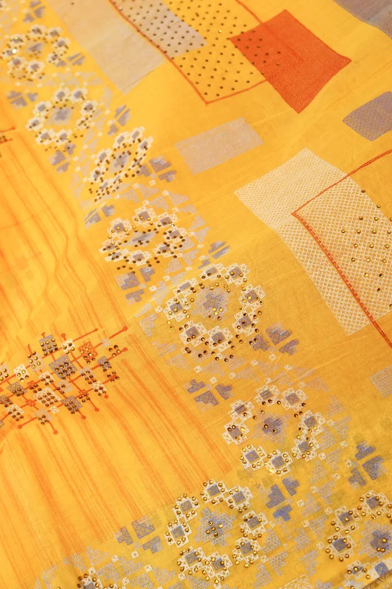 - Saree Details : Saree Fabric :- Handloom Cotton | Blouse Fabric :- Handloom Cotton | Saree Work :- Booti Design With Multi Color Print & Stone Hand Work | Blouse Work : Yellow Color With Plain Blouse | Saree Color: Yellow Color | Blouse Color : Yellow Color |