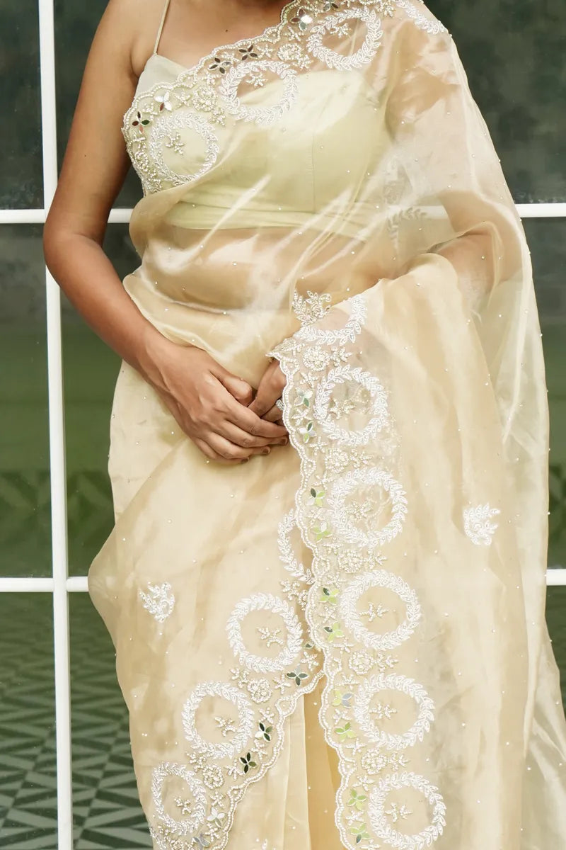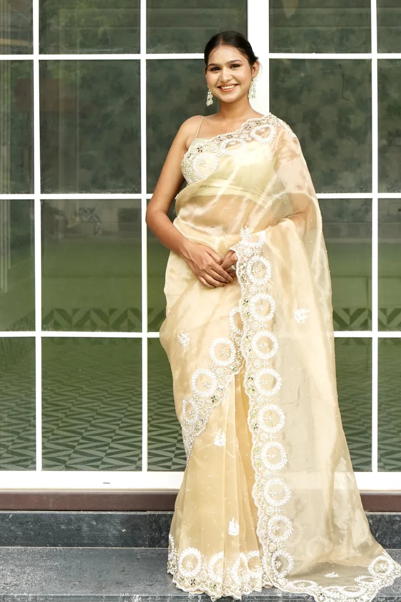 - Saree Details : Saree Fabric: Tissue Silk | Blouse Fabric:Tissue Silk | Saree Work: zardosi With Mirror Stone Handwork Border| Blouse Work : | Zardosi With Mirror Stone Work Border Saree Color: Biege | Blouse Color: Biege