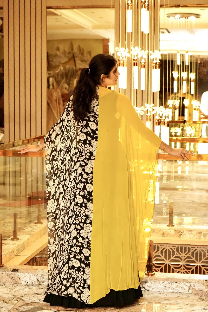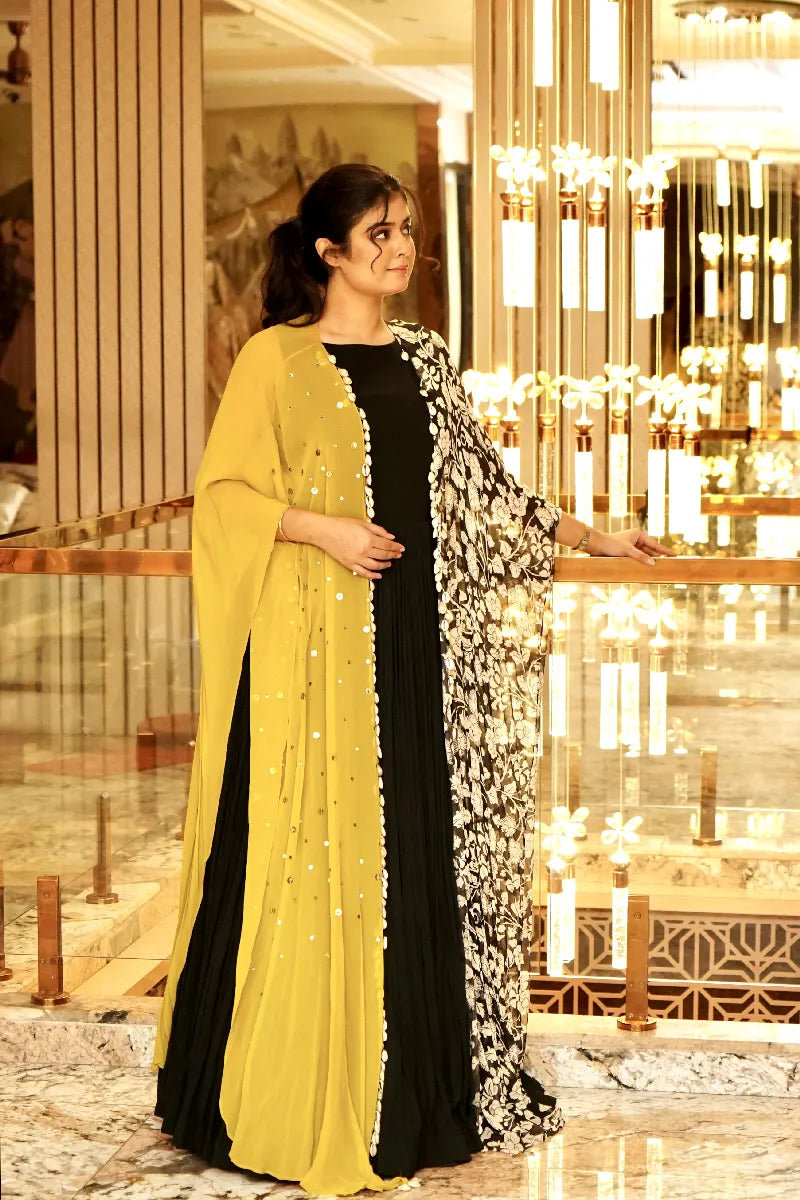 Work:- Black And Yellow Color Gown Sequence Flower And Shell Handwork