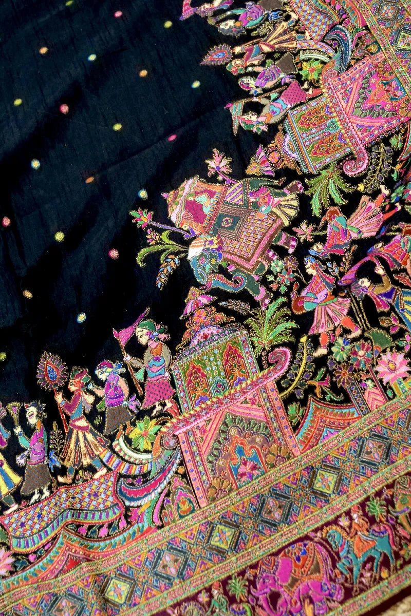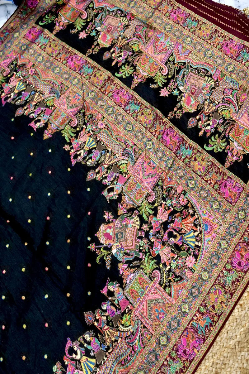 - Saree Details : Saree Fabric: Crepe Silk | Blouse Fabric: Crepe Silk | Saree Work: Meenakari Booti With Rajwada Concept Meenakari Border | Blouse Work: Meenakari Booti With Rajwada Border | Saree Color: Black Color | Blouse Color: Maroon Color