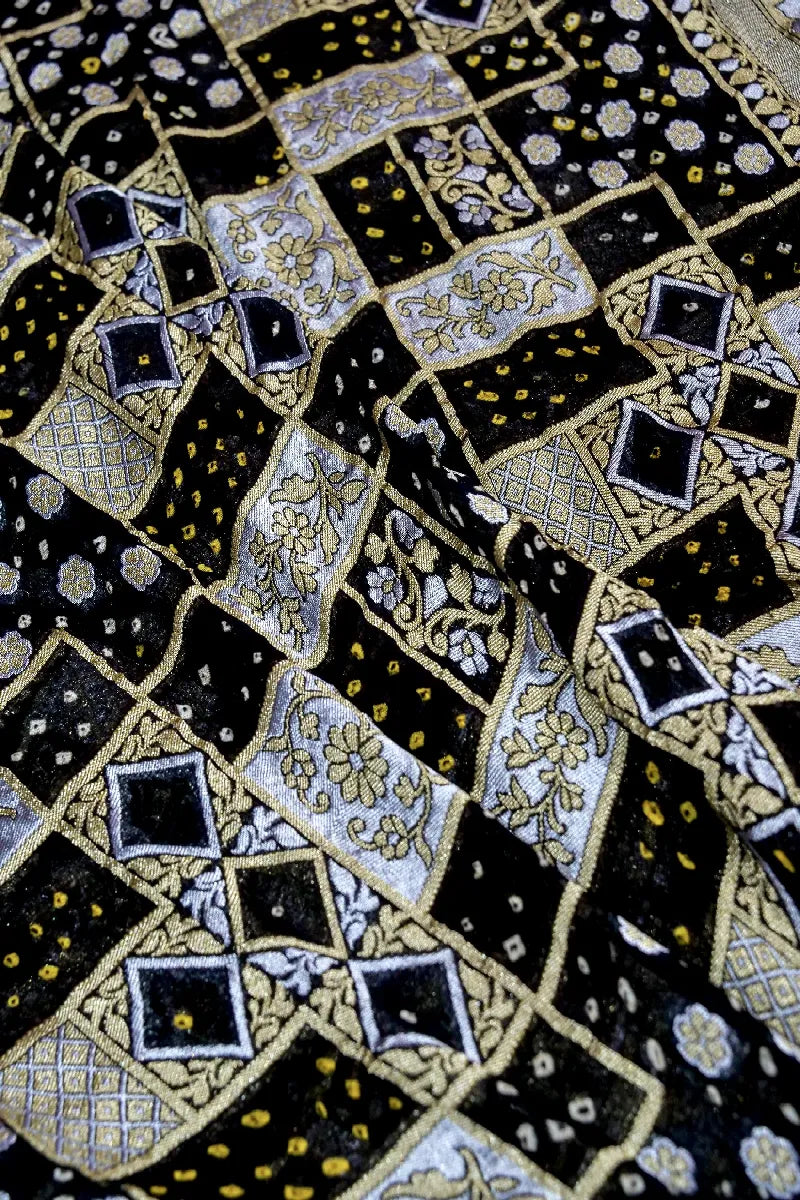 - Saree Details :Saree Fabric: Pure Handloom Khadi Georgette Bandhani | Blouse Fabric: Pure Handloom Khadi Georgette Bandhani | Saree Work: Hand Woven Golden Zari (Roopasona) Jaal Work | Blouse Work: Bandhani Print With Golden Zari Border | Saree Color: Black | Blouse Color :Black