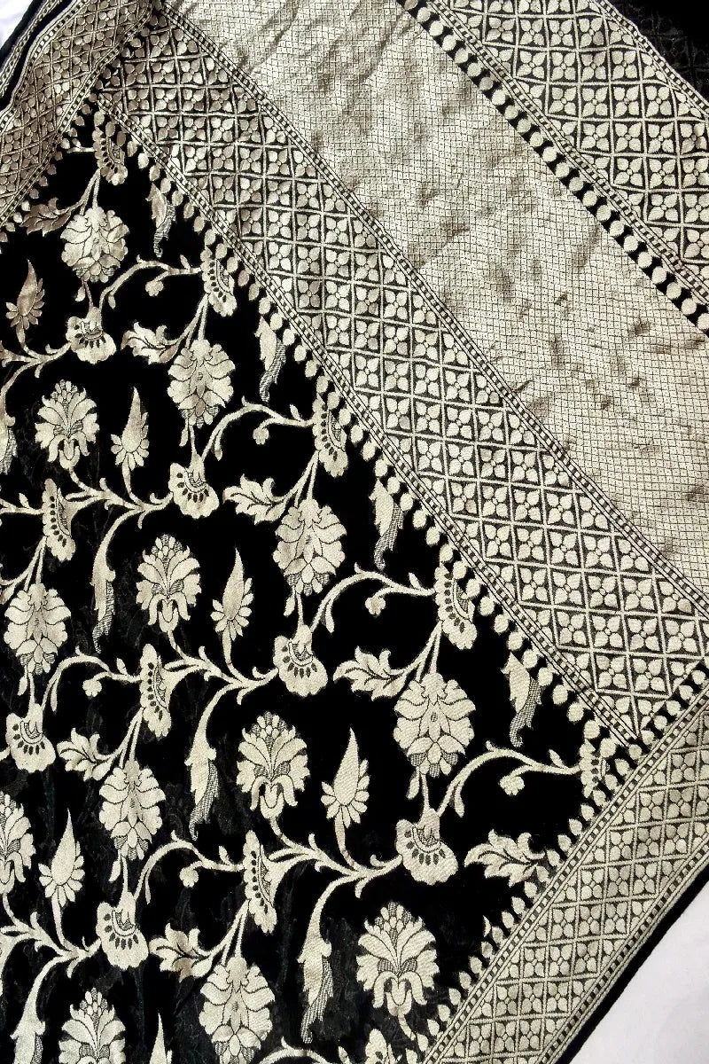 - Saree Details :Saree Fabric: Pure Handloom Khadi Georgette | Blouse Fabric: Pure Handloom Khadi Georgette | Saree Work: Hand Woven Copper Zari Jaal Work | Blouse Work:Plain With Copper Zari Border | Saree Color: Black| Blouse Color:Black