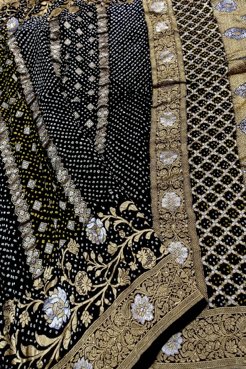 - Saree Details :Saree Fabric: Pure Handloom Khadi Georgette Bandhani | Blouse Fabric: Pure Handloom Khadi Georgette Bandhani | Saree Work: Hand Woven Golden Zari Boota Bandhani | Blouse Work: Bandhani Print With Golden Zari Border | Saree Color:Black | Blouse Color:Black