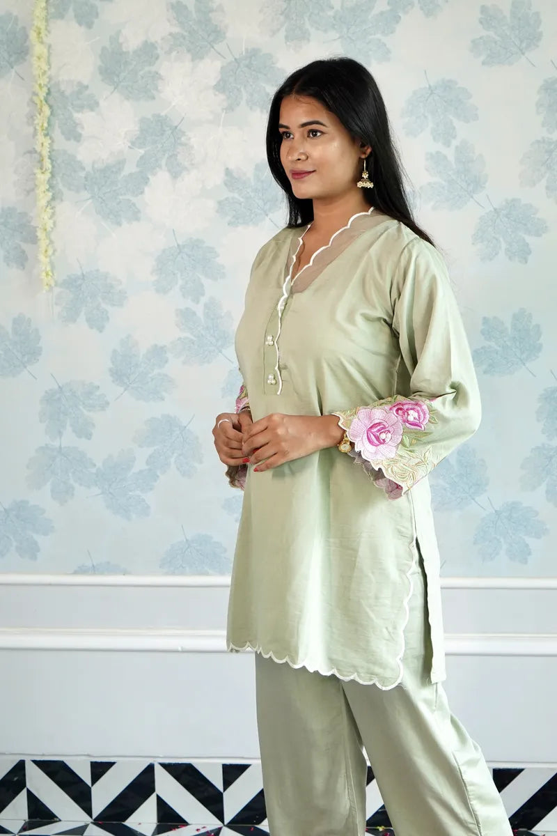 ROSE WHISPER – SAGE GREEN CO-ORD WITH EMBROIDERED SLEEVES