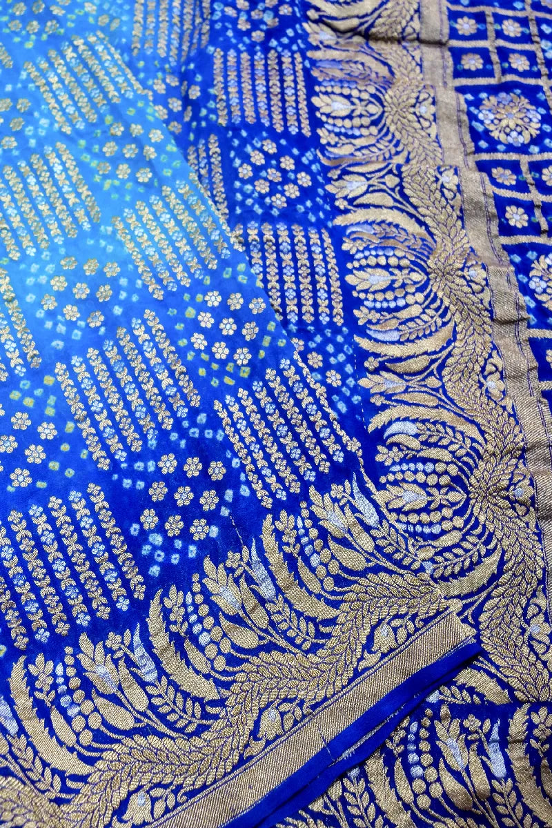 - Saree Details :Saree Fabric: Pure Handloom Khadi Georgette Bandhani | Blouse Fabric: Pure Handloom Khadi Georgette Bandhani | Saree Work: Hand Woven Golden Zari Gharchola Booti Work | Blouse Work: Bandhani Print With Golden Zari Border | Saree Color:Blue | Blouse Color:Blue