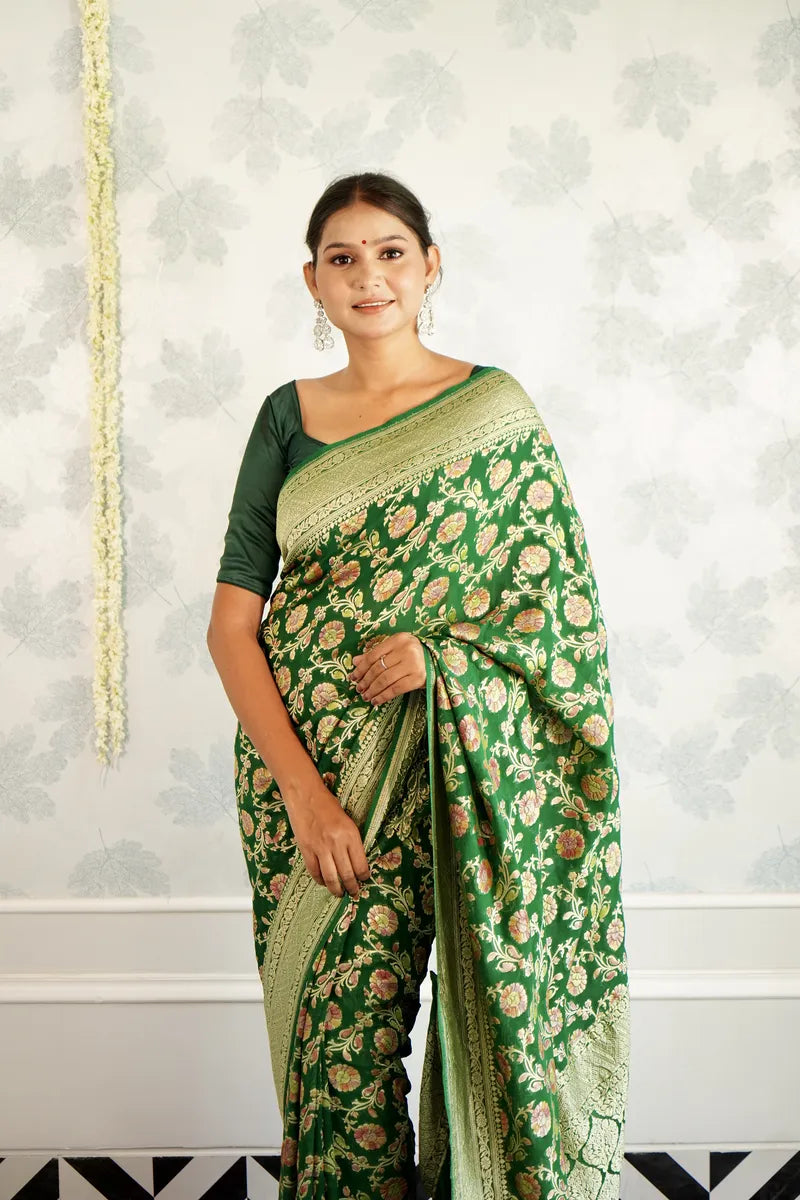 EMERALD GREEN KHADDI GEORGETTE SAREE WITH FLORAL JAAL WEAVING & ZARI BORDER