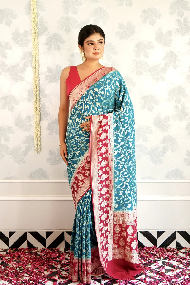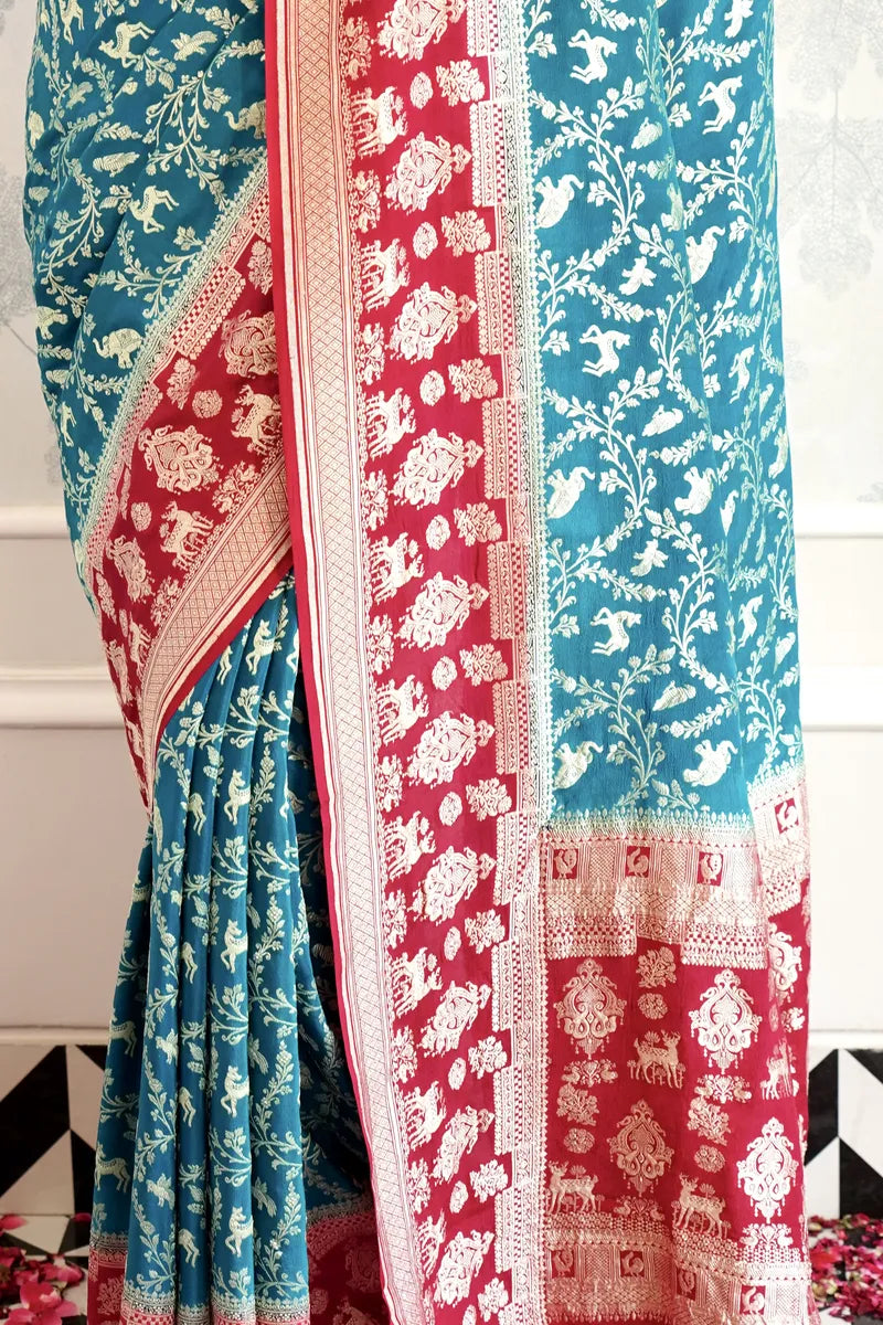 TEAL BLUE & MAROON KHADDI GEORGETTE SAREE WITH INTRICATE ZARI WORK & FLORAL MOTIFS – TRADITIONAL HANDWOVEN ELEGANCE