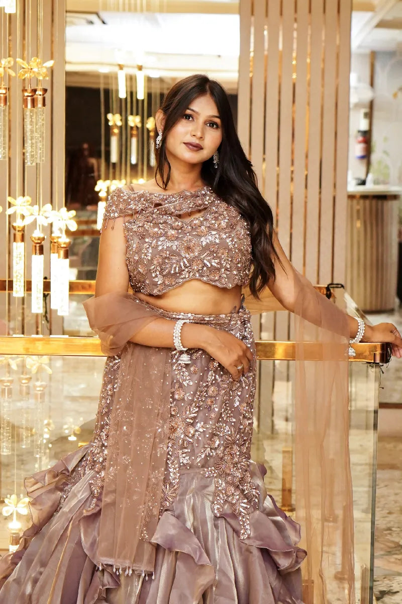 MAUVE COLOUR FISH CUT DESIGN INDO-WESTERN LEHENGA