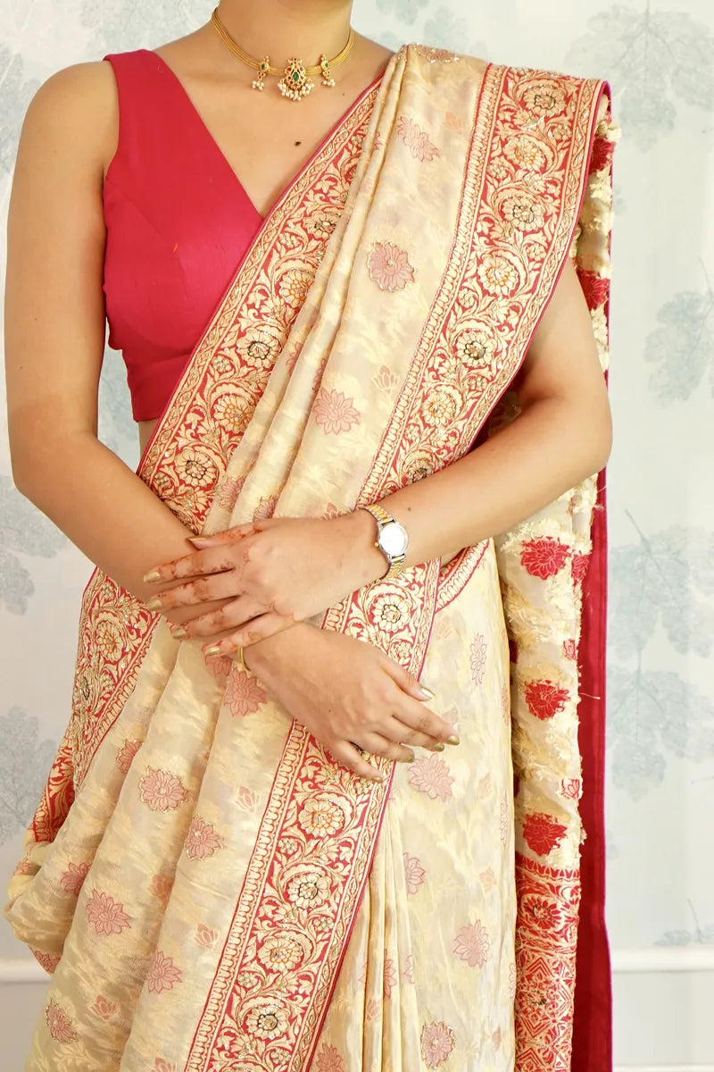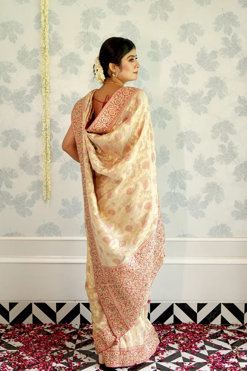 - Saree Details :Saree Fabric: Organza Silk | Blouse Fabric:Organza Silk | Saree Work:Golden Zari With Zardosi Pearls Jaal Pattern Handwork Border| Blouse Work Golden Zari Handwork Border Saree Color Creme Color | Blouse Color: Creme Color