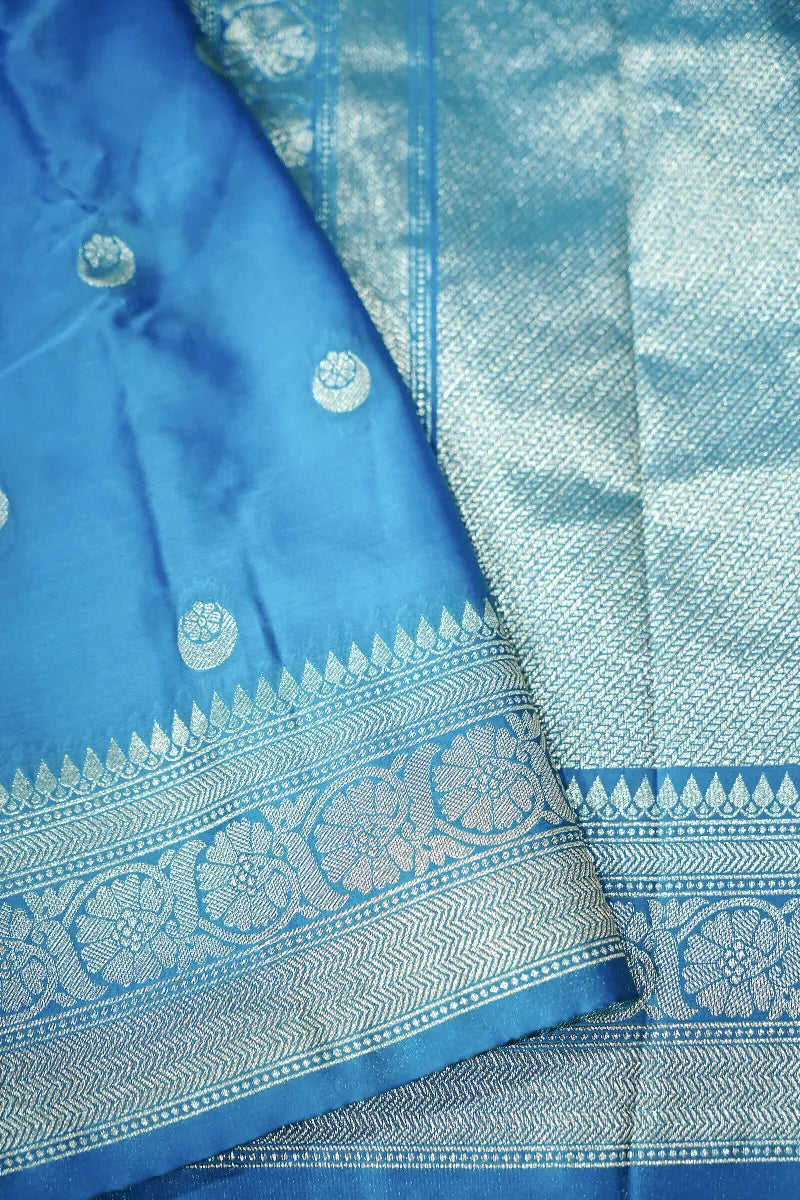 Saree Details : Saree Fabric : Banarasi Silk | Blouse Fabric : Banarasi Silk | Saree Work : All Over Booti With Golden Zari Border | Blouse Work : Booti With Golden Zari Border | Saree Color : Firozi With Golden Border | Blouse Color : Firozi |