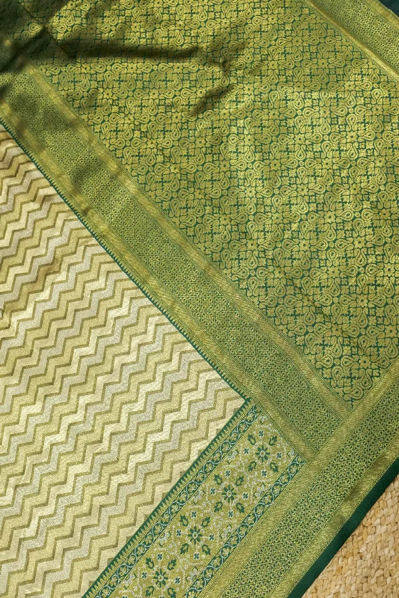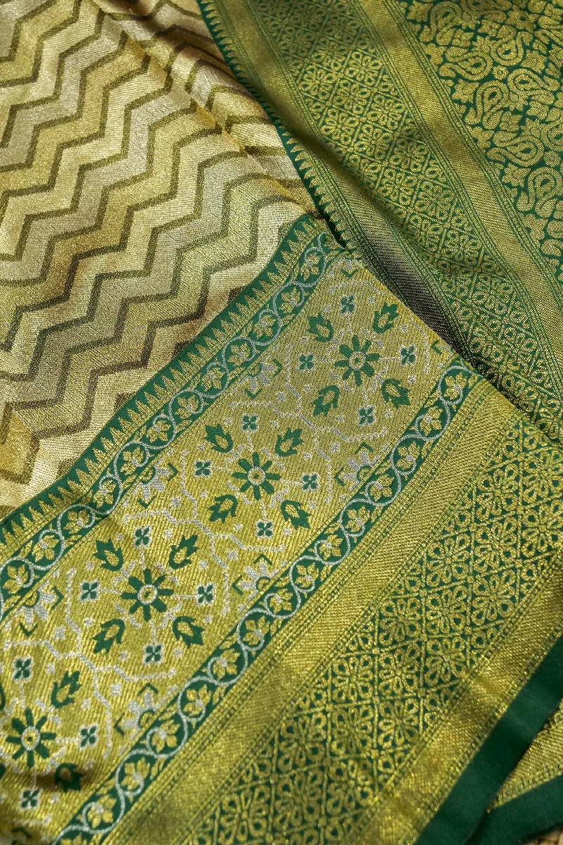 - Saree Details :Saree Fabric: Banarasi Silk | Blouse Fabric: Banarasi Silk | Saree Work: golden And Silver Zari Zigzag Pattern Golden And Silver Zari Border | Blouse Work : Plain With Golden And Silver Zari Border | Saree Color: Golden With Green Blouse Color: Green