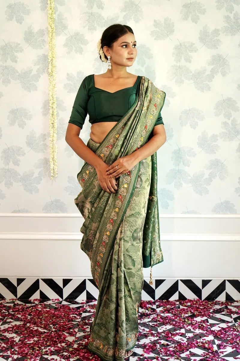 - Saree Details : Saree Fabric: Gaji Silk| Blouse Fabric :Gaji Silk | Saree Work: golden Zari Meenakari & Flower Concept Border| Blouse Work :Plain | Saree Color: Green | Blouse Color: Green
