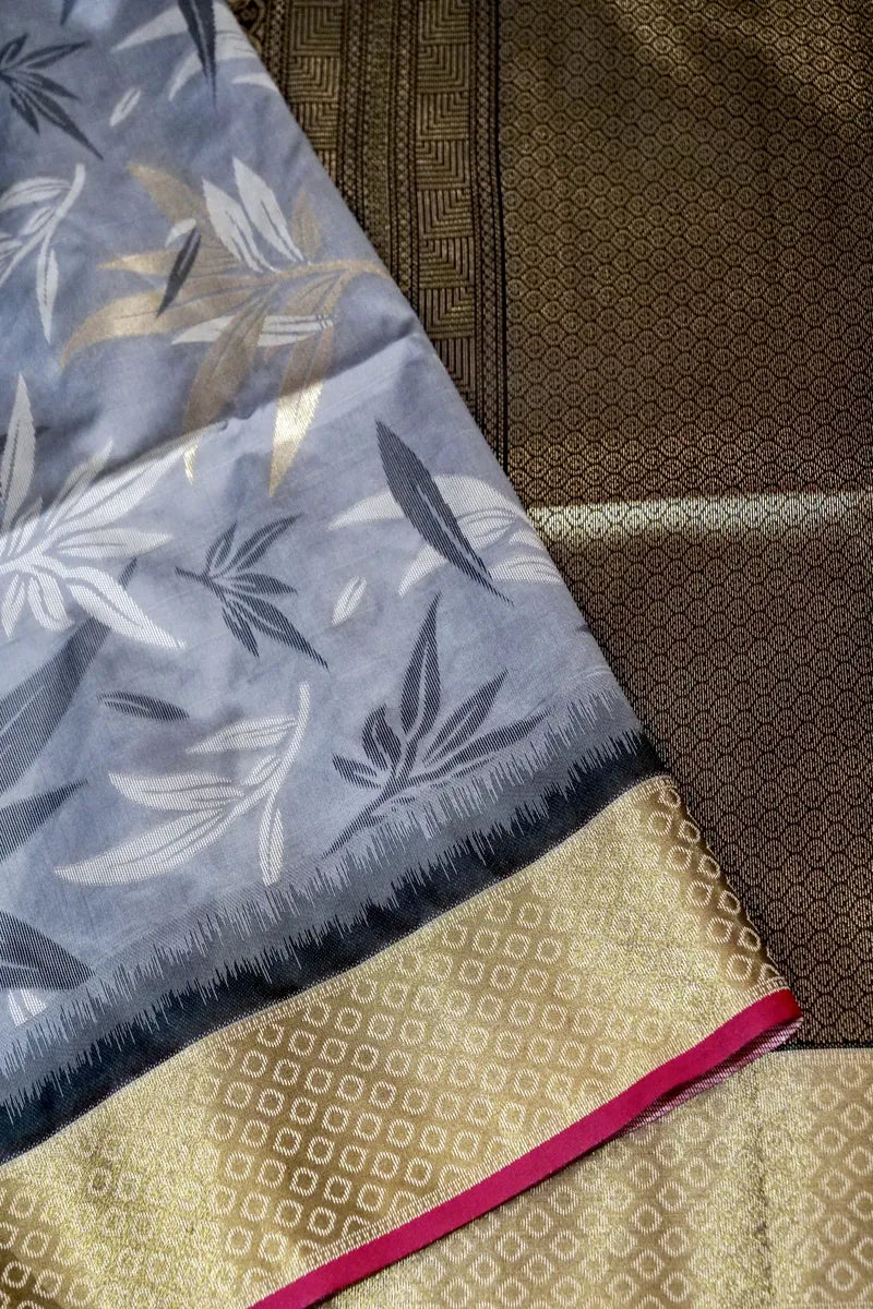 Saree Details: Saree Fabric : Banarasi Silk | Blouse Fabric : Banarasi Silk | Saree Work : All Over Resham Zari Hand Work With Golden Zari Border | Blouse Work : All Over Choti Buti With Golden Zari Border | Saree Color : Grey With Black Color | Blouse Color : Black Color |