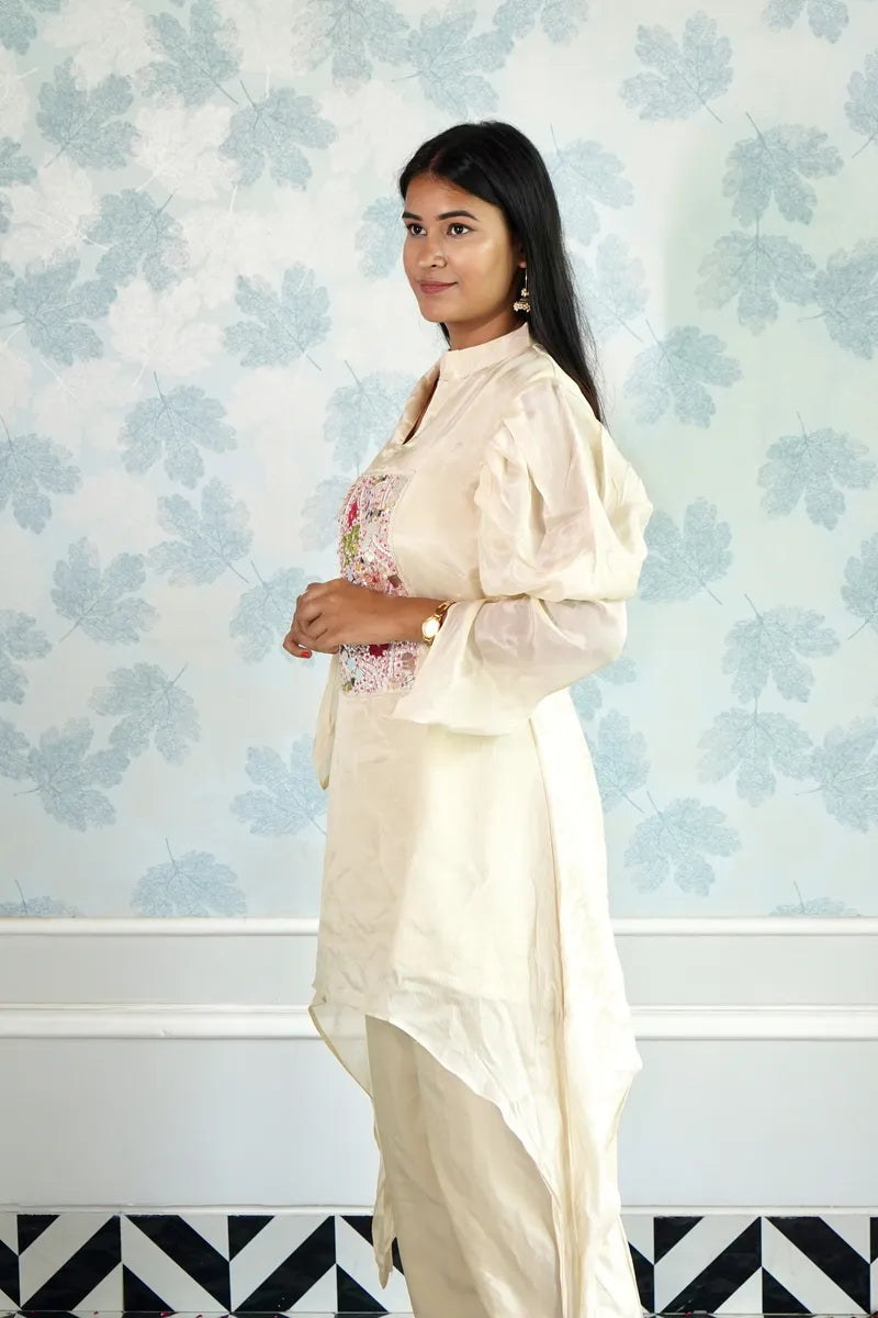 IVORY EMBROIDERED KURTA SET WITH PLEATED SLEEVES & FLORAL YOKE