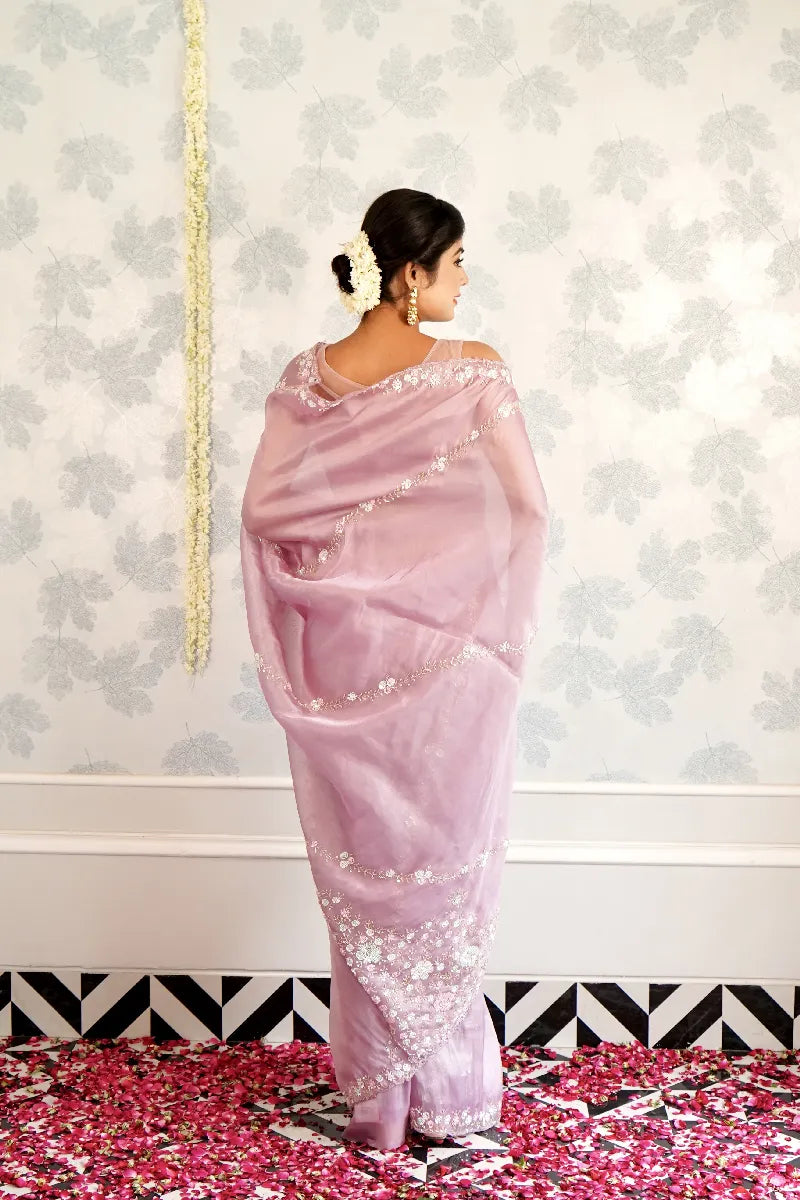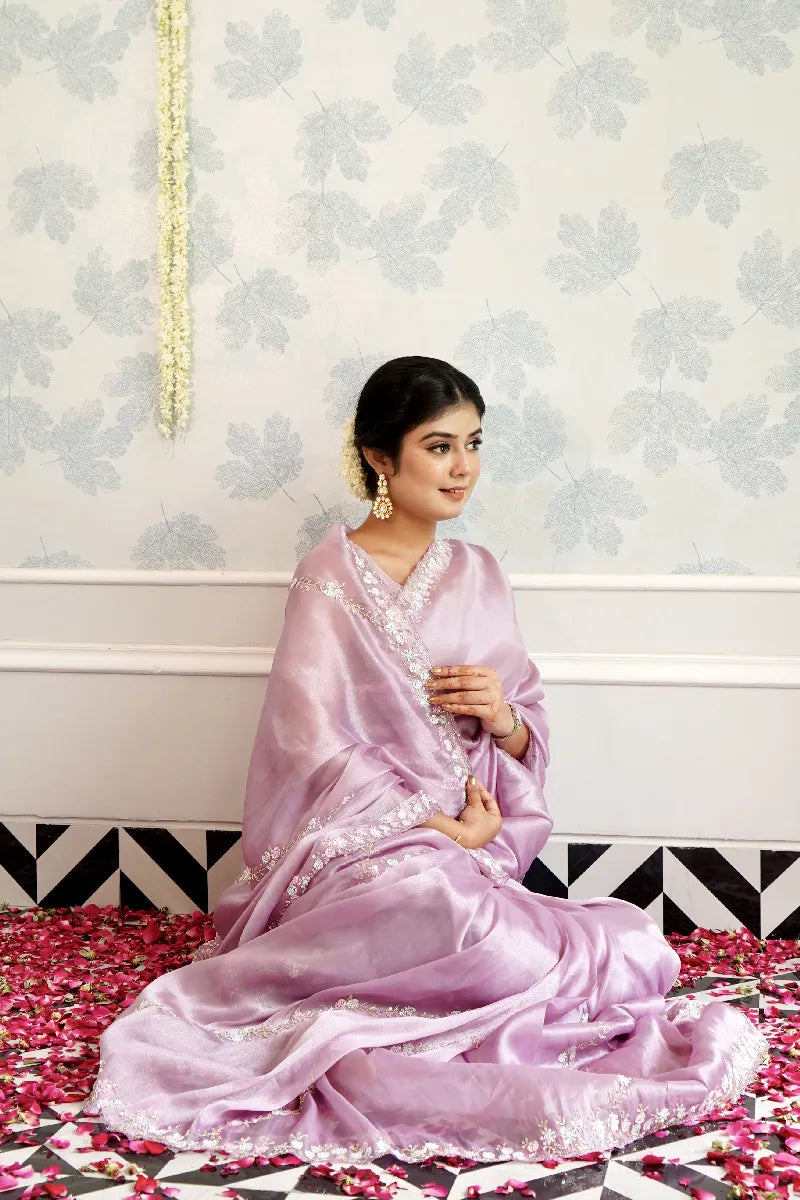 - Saree Details : Saree Fabric: Organza Silk | Blouse Fabric: Organza Silk | Saree Work: Cutdana , Pearls & Tikki Sequence & Lehenriya Design | Blouse Work : Cutdana , Pearls & Tikki Sequence & | Saree Color: Lavender | Blouse Color: Lavender