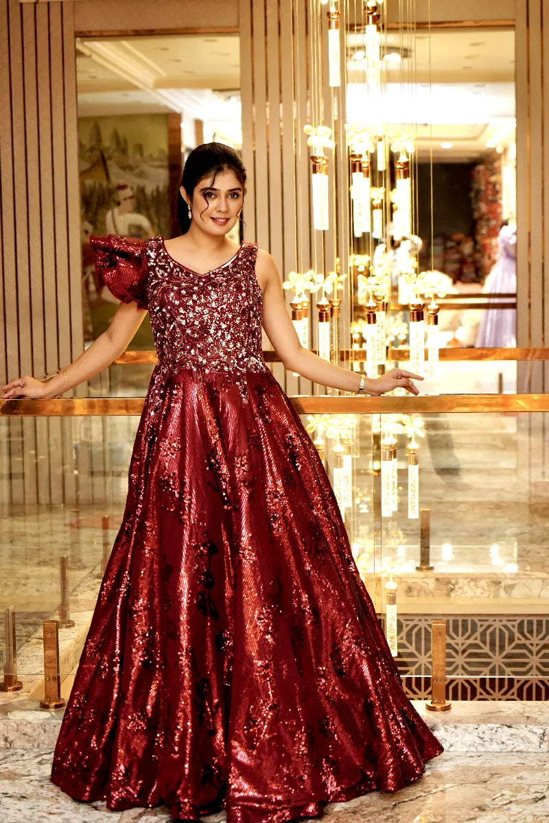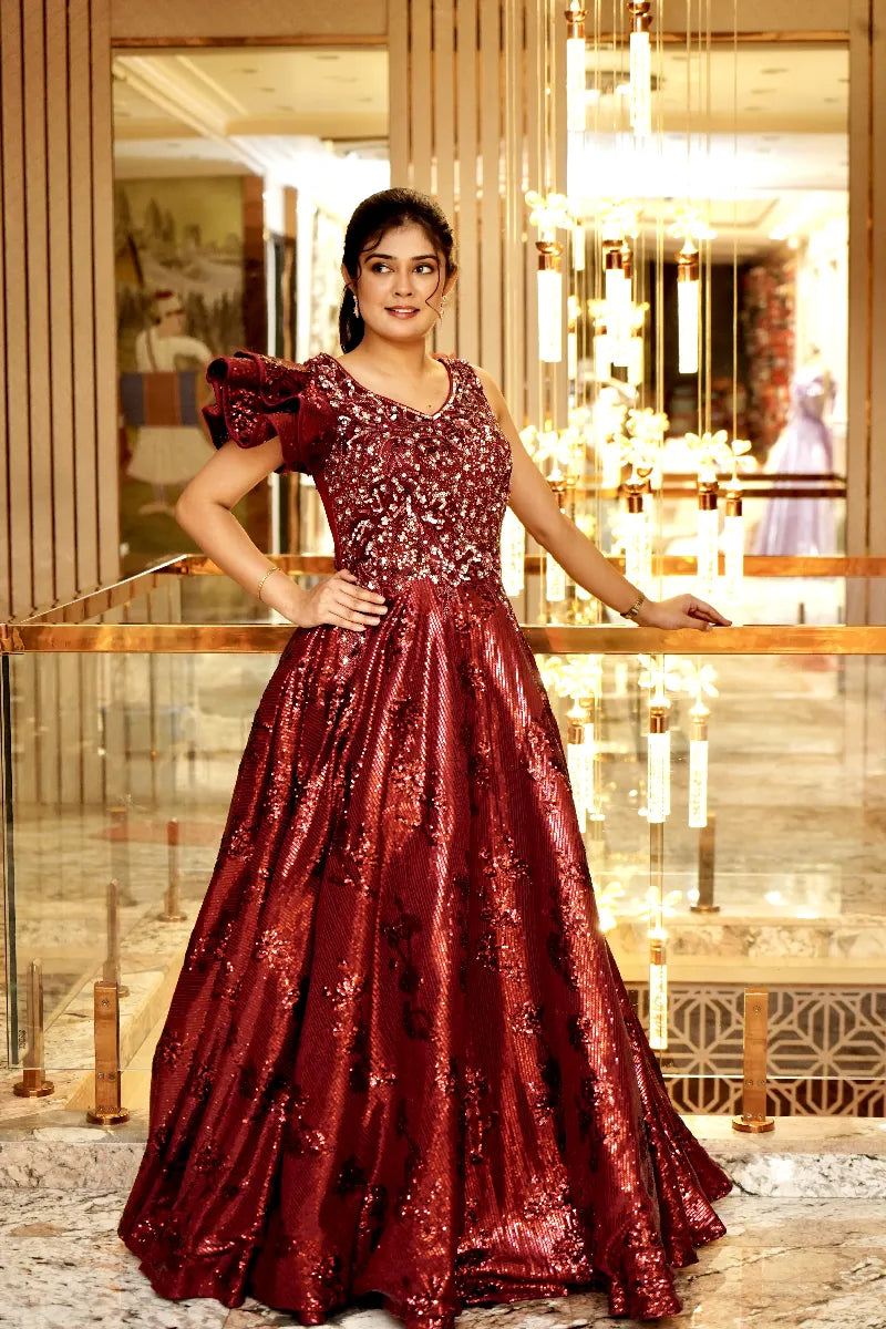 MAROON SEQUINS EMBROIDERED NET COCKTAIL GOWN
