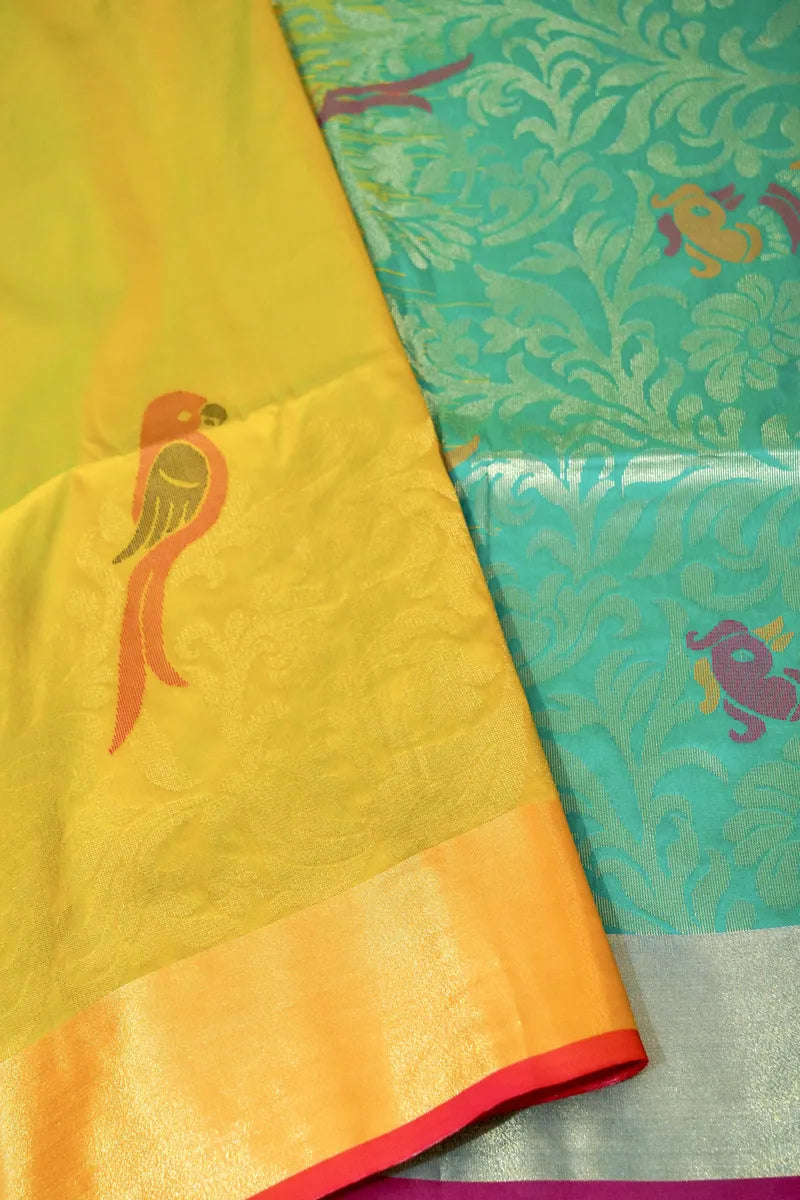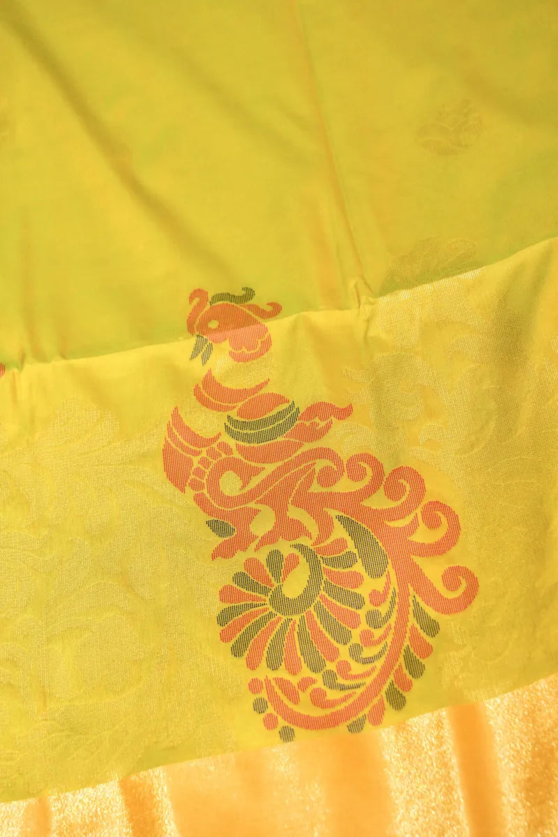 Saree Details: Saree Fabric: Banarasi Silk | Blouse Fabric: Banarasi Silk | Saree Work: Scout Pattern & Figure Concept Design With Resham & Golden Zari Hand Work | Blouse Work: Plain With Golden Zari Border | Saree Color: Mehndi With Green Color | Blouse Color : Rama Green Color |