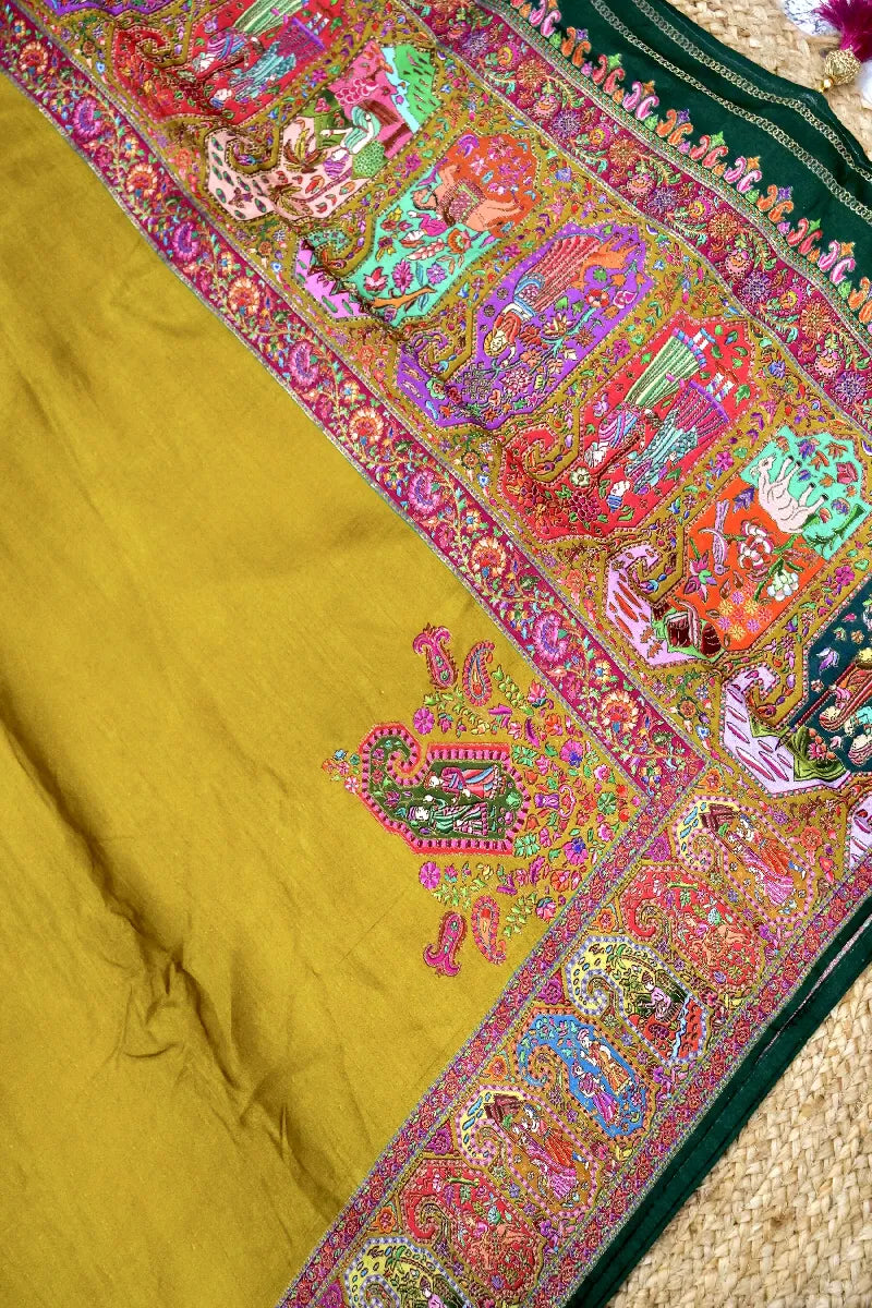 - Saree Details :Saree Fabric: Crepe Silk | Blouse Fabric: Crepe Silk | Saree Work: Plane Saree With Figure Concept Meenakari Border(Pashmina) | Blouse Work: Meenakari Booti With Meenakari Border | Saree Color: Mustard Yellow Color | Blouse Color: Red Color