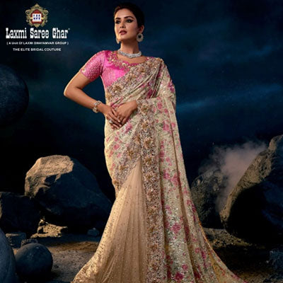 - Saree Details :Saree Fabric Khaddi Georgette | Blouse Fabric: Khaddi Georgette | Saree Work: Golden Zari Boota & Meenakari With Cutdana Handwork Border Work | Blouse Work : Plain Golden Zari Border Work | Saree Color: Orange With Pink Color
