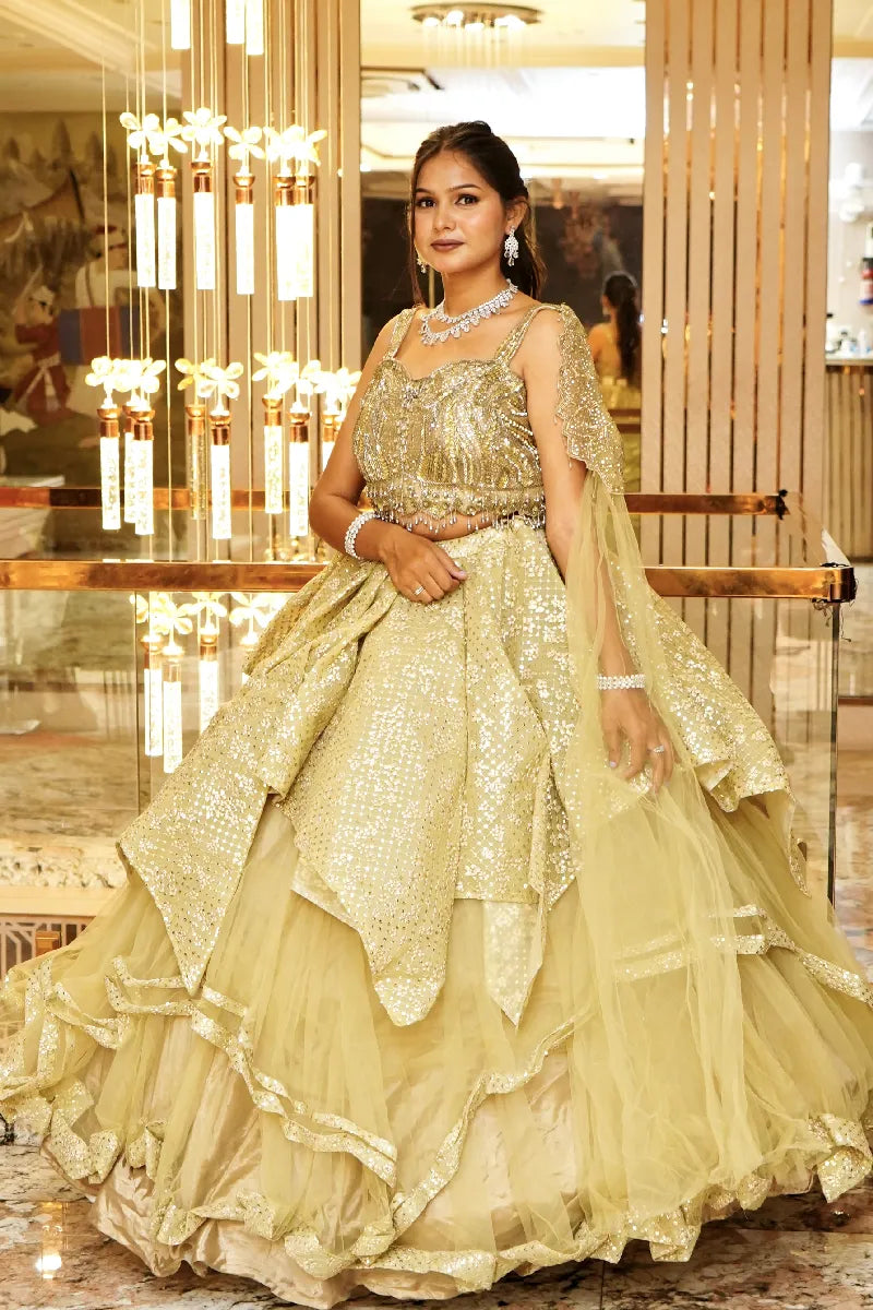 Size:- 1. Crop-top Lehenga: Free Size, Lehenga: Length- 42" Inches, Flair, Bottom-up to 3.5 Mtr. | 2. Blouse: Stitched, Free Size | 3. Dupatta: 2.50 Meter |