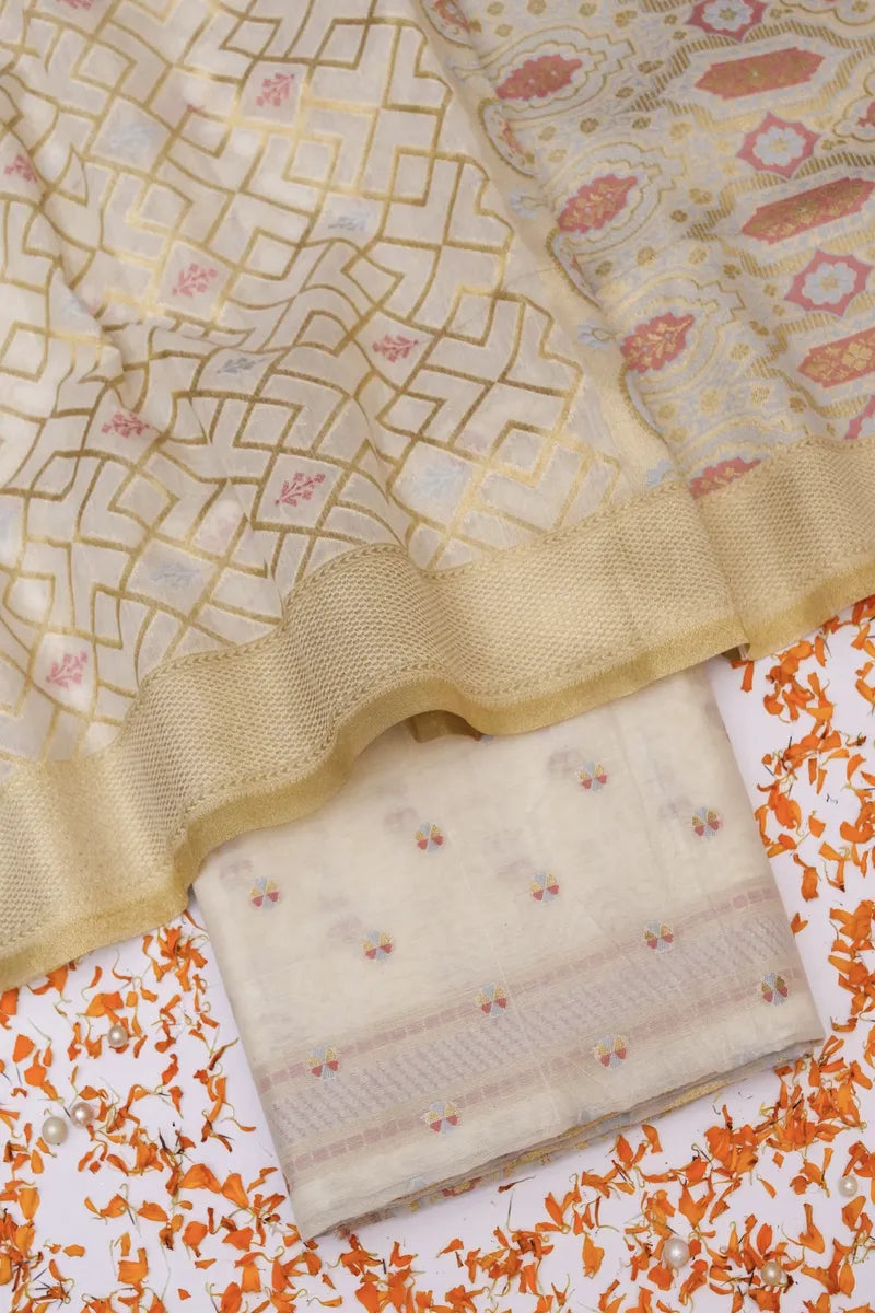 PURE BANARASI CHANDERI SILK OFF WHITE COLOR UNSTITCHED SUIT