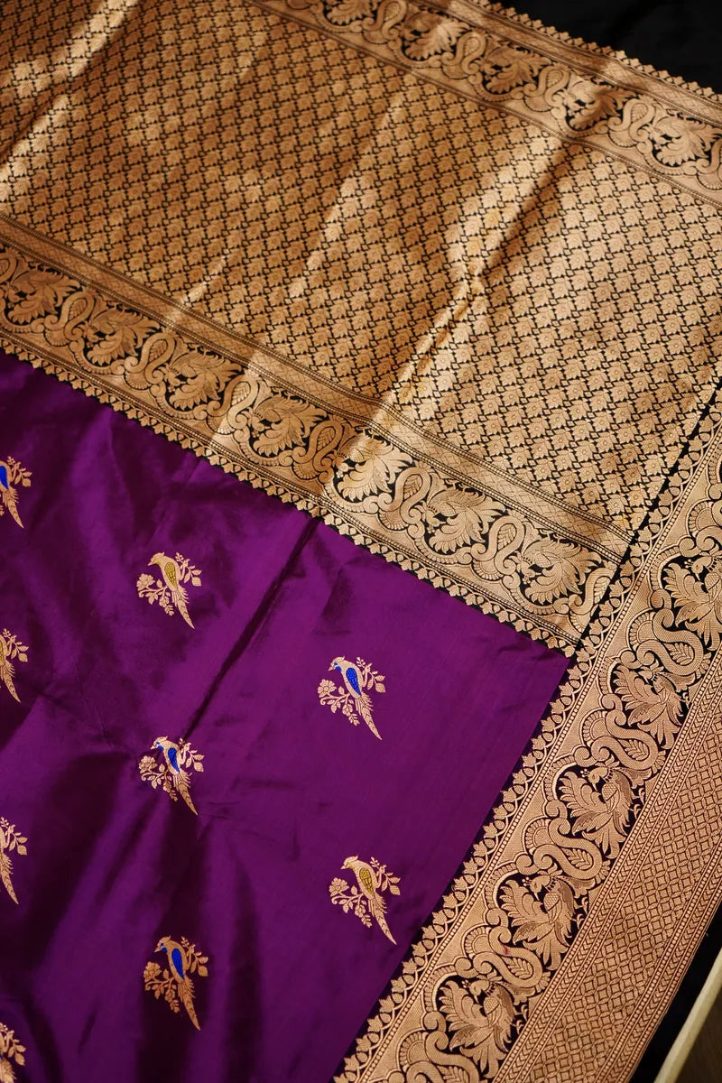 Saree Details : Saree Fabric : Pure Banarasi Single Katan Silk | Blouse Fabric: Pure Banarasi Single Katan Silk | Saree Work : Golden Zari With Meenakari Parrot Figure Design | Blouse Work : Golden Zari Border With Booti | Saree Color : Magenta With Black Border | Blouse Color : Black