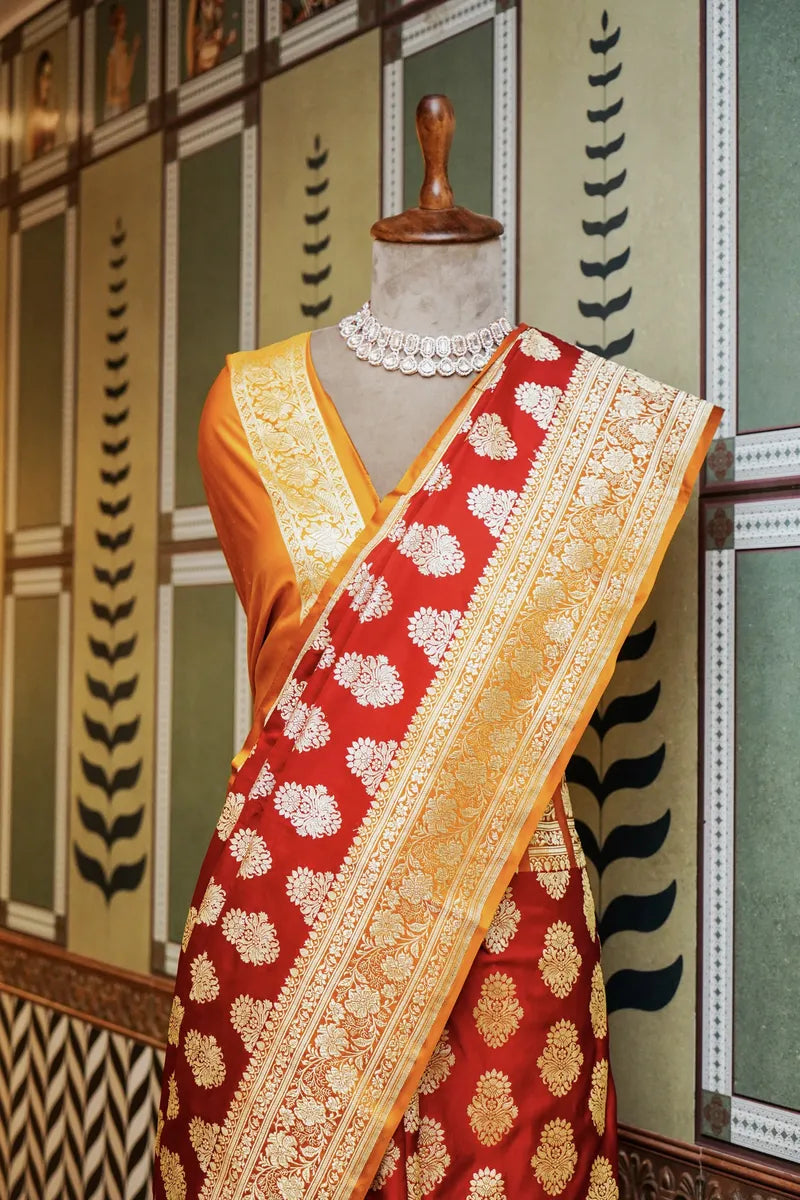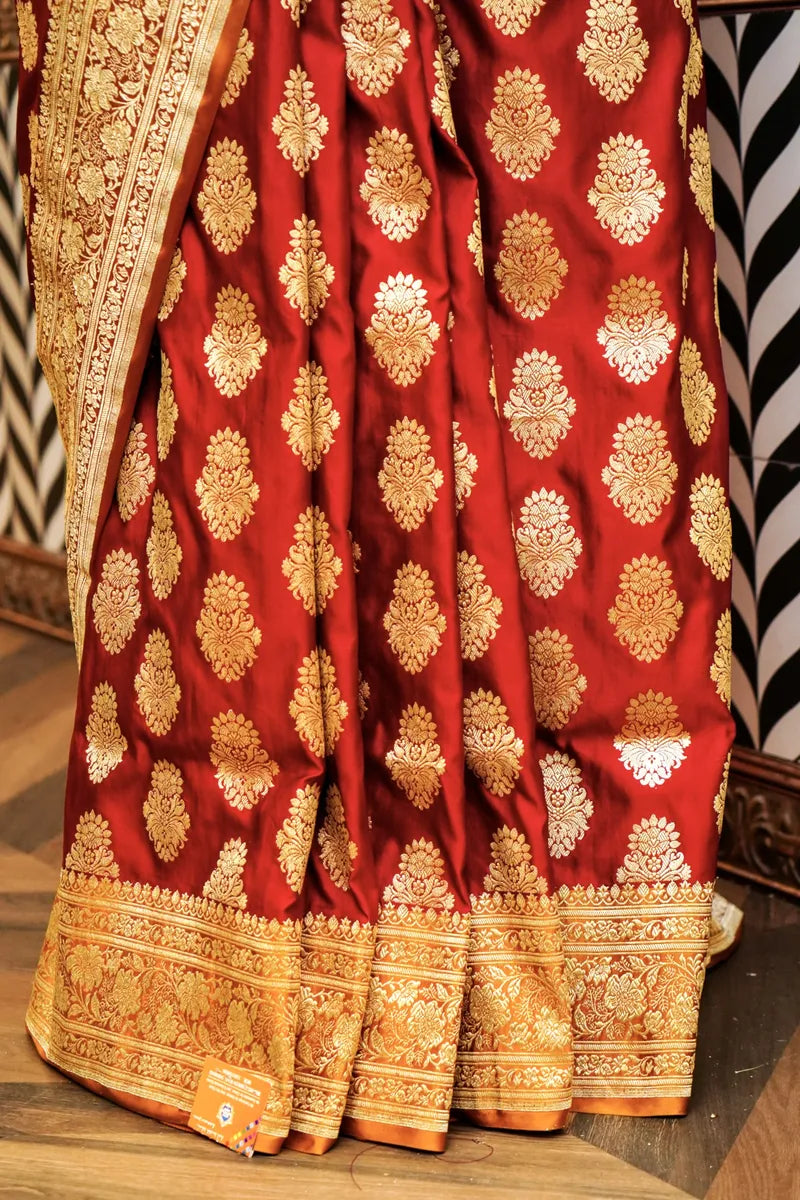 Saree Details : Saree Fabric: Pure Banarasi Double Katan Silk | Blouse Fabric: Pure Banarasi Double Katan Silk | Saree Work: Golden Zari Boota | Blouse Work: Golden Zari Border Plain | Saree Color : Maroon With Mustard Yellow| Blouse Color: Mustard Yellow