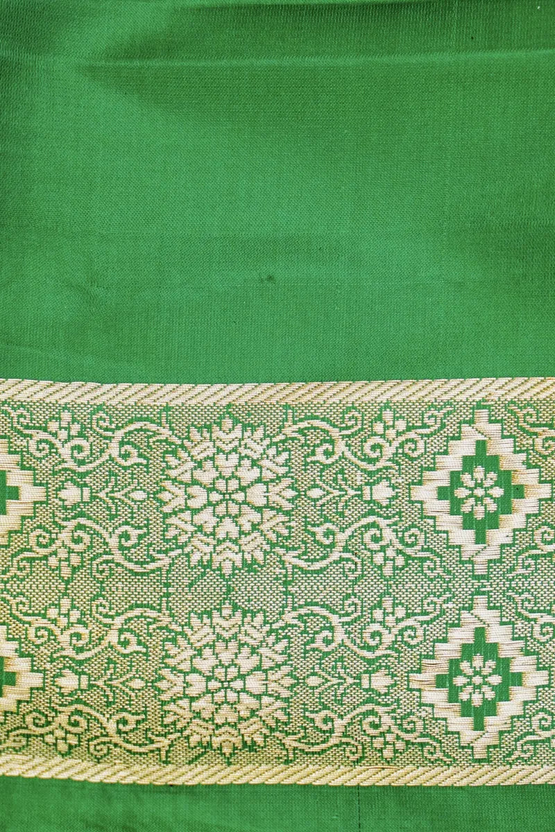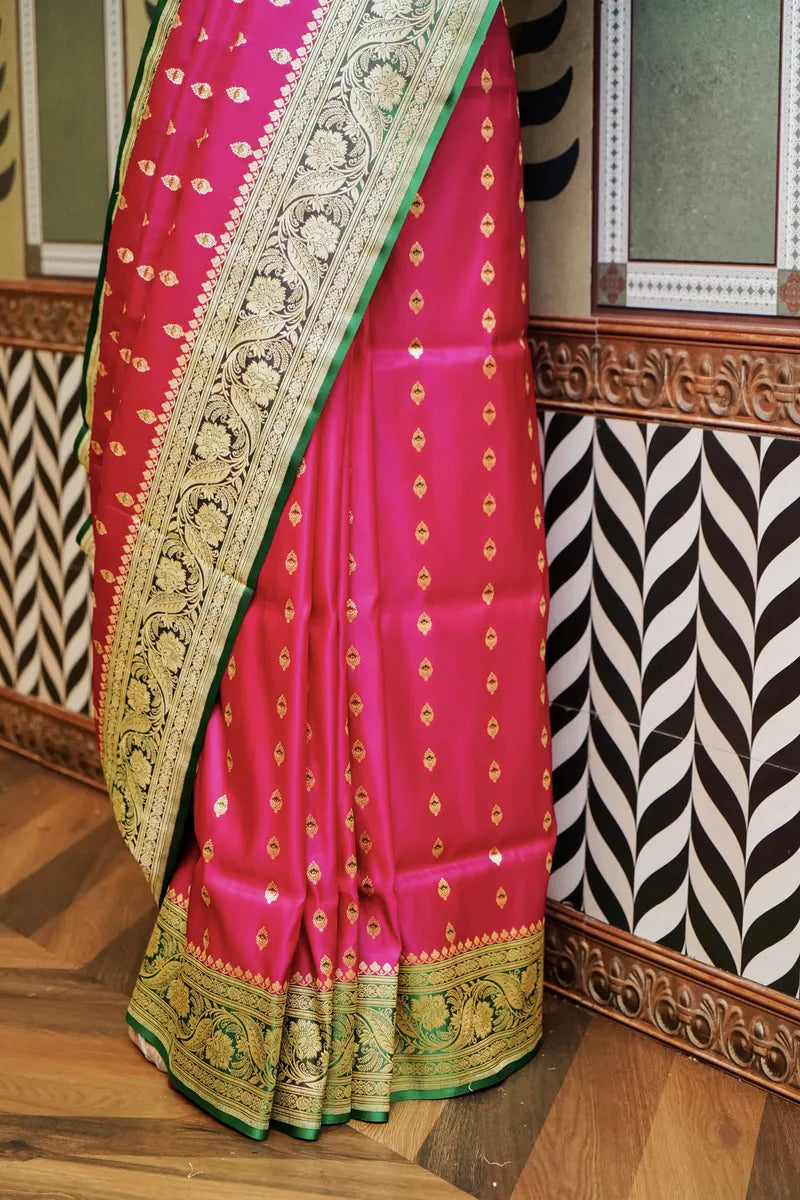 Saree Details : Saree Fabric : Pure Banarasi Double Katan Silk | Blouse Fabric : Pure Banarasi Double Katan Silk | Saree Work : Golden Zari With Meenakaari Booti & Aanchal | Blouse Work : Golden Zari Border Plain | Saree Color: Rani With Green Border | Blouse Color: Green