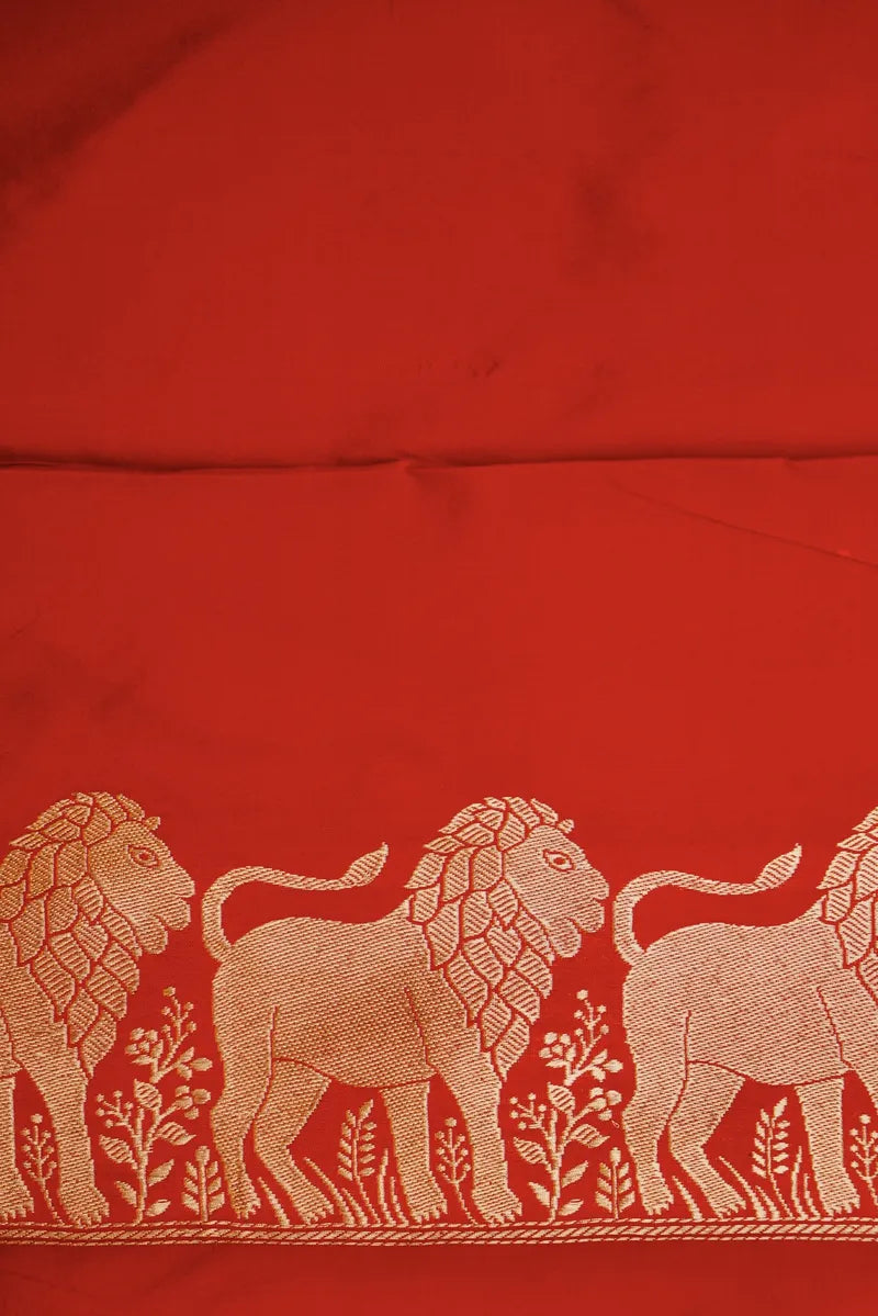 Saree Details : Saree Fabric : Pure Banarasi Single Katan Silk | Blouse Fabric : Pure Banarasi Single Katan Silk | Saree Work : Silver & Golden Zari Lion Figure Design | Blouse Work : Golden Zari Lion Border Plain | Saree Color : Rani With Red Border | Blouse Color : Red