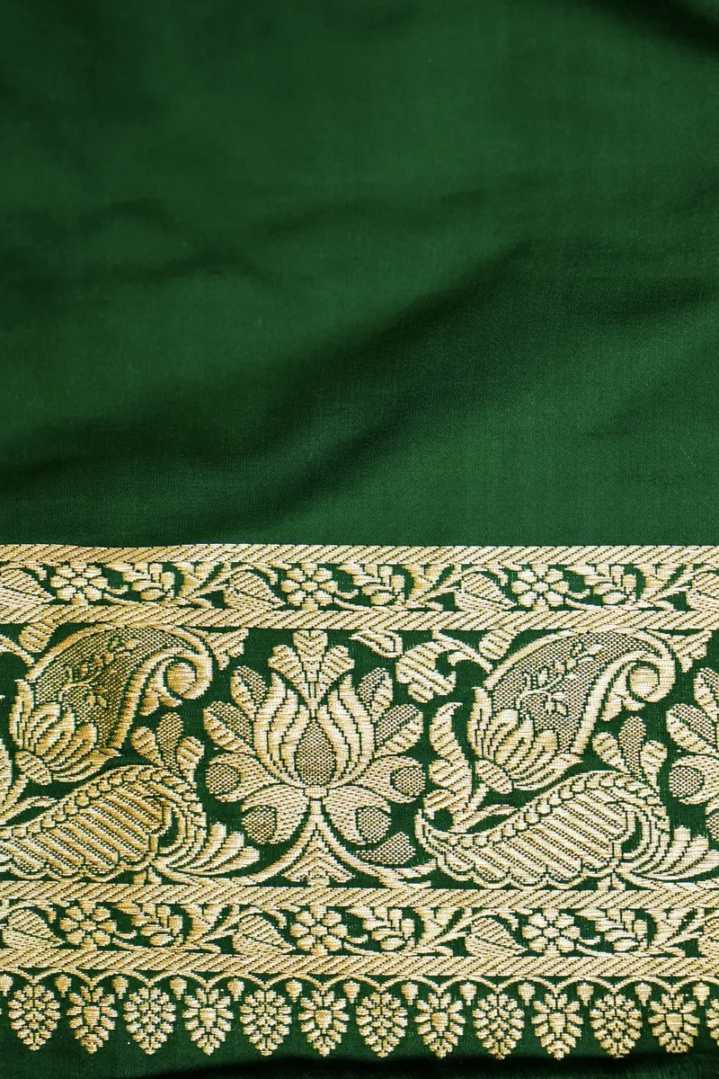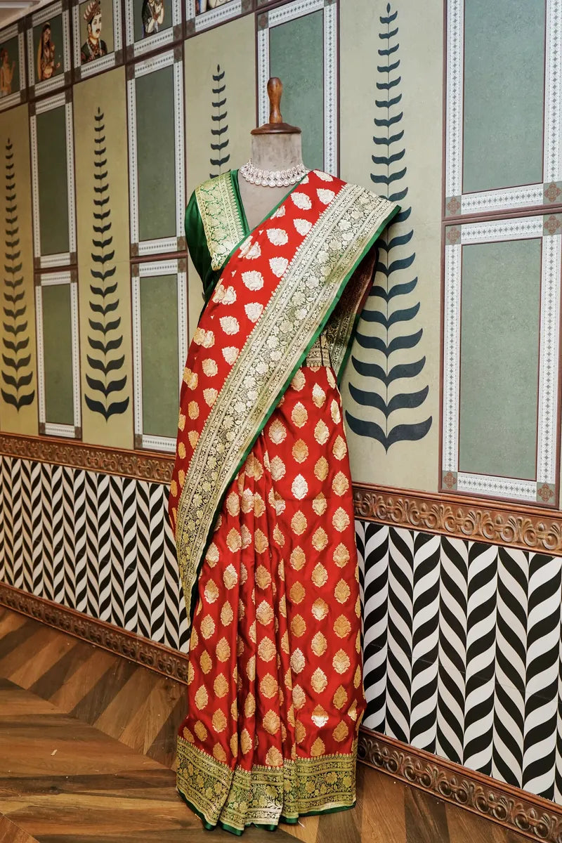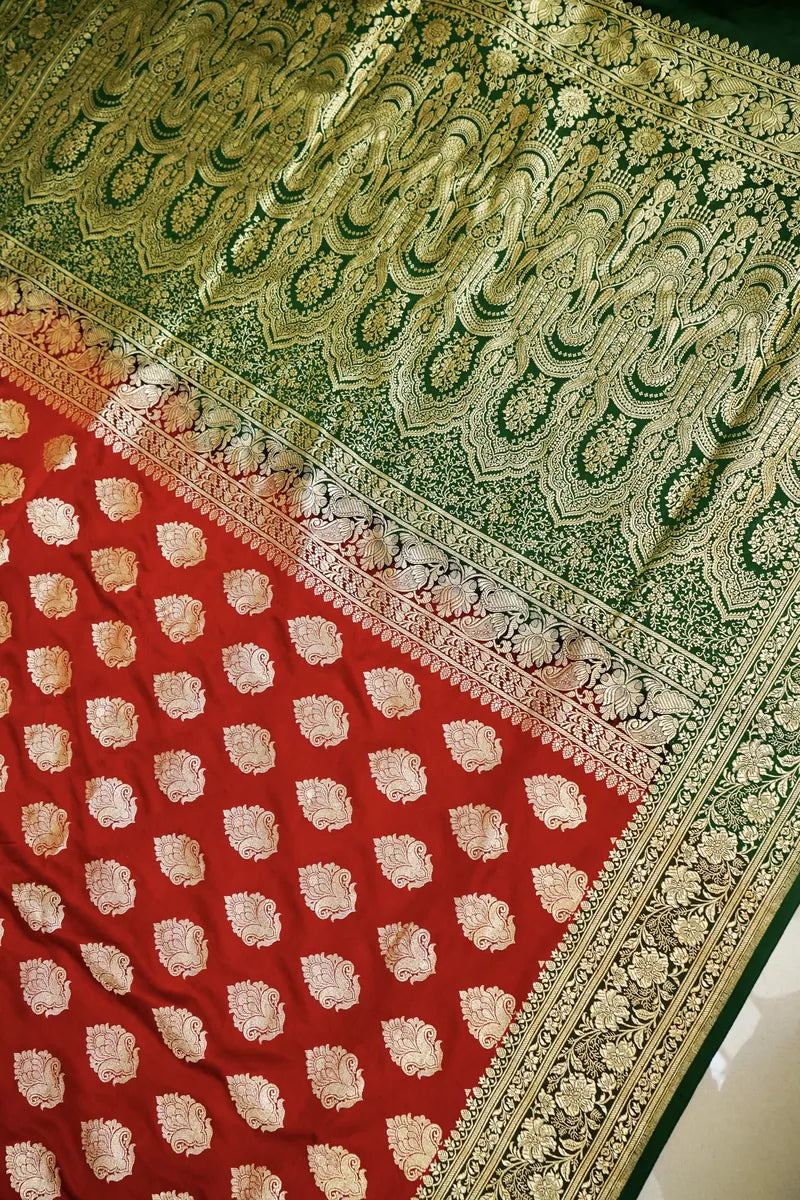 Saree Details : Saree Fabric: Pure Banarasi Double Katan Silk | Blouse Fabric: Pure Banarasi Double Katan Silk | Saree Work: Golden Zari Boota | Blouse Work: Golden Zari Border Plain | Saree Color: Bridal Red With Green Border | Blouse Color: Green