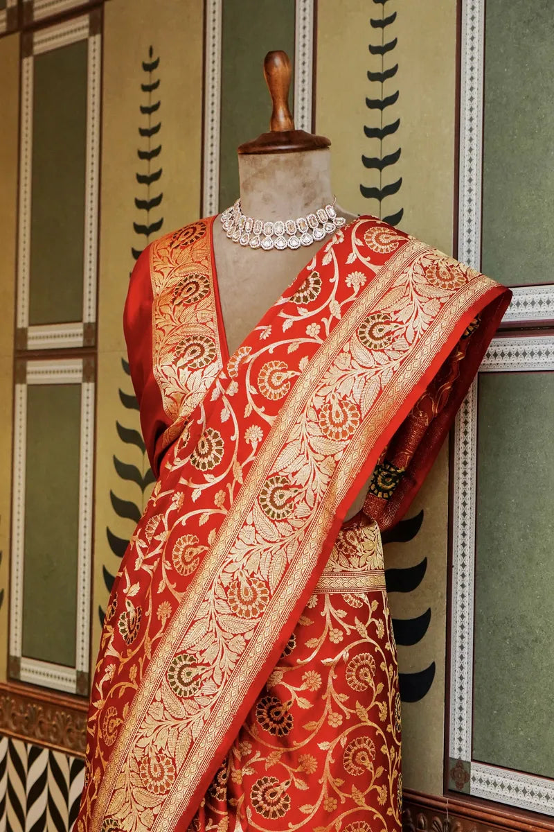 Saree Details : Saree Fabric : Pure Banarasi Double Katan Silk | Blouse Fabric : Pure Banarasai Double Katan Silk | Saree Work : Golden Zari Meenkaari Jaal | Blouse Work: Golden Zari Border Plain | Saree Color : Red | Blouse Color : Red