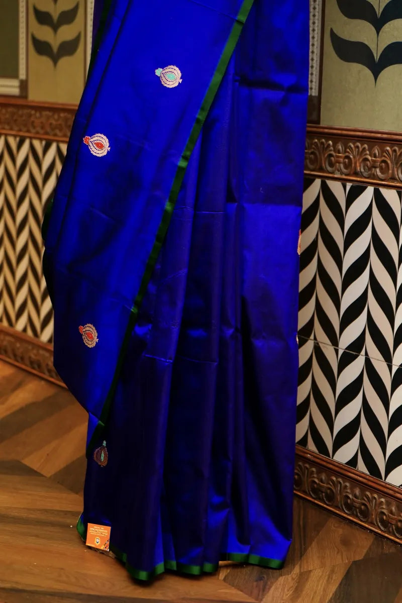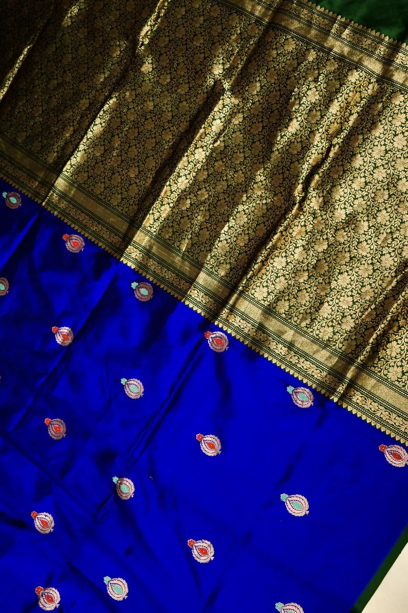 Saree Details : Saree Fabric : Pure Banarasi Single Katan Silk | Blouse Fabric : Pure Banarasi Single Katan Silk | Saree Work : Golden ZariI Meenakaari Boota Work | Blouse Work : Golden Zari Booti | Saree Color: Royal Blue With Green Pieping | Blouse Color : Green