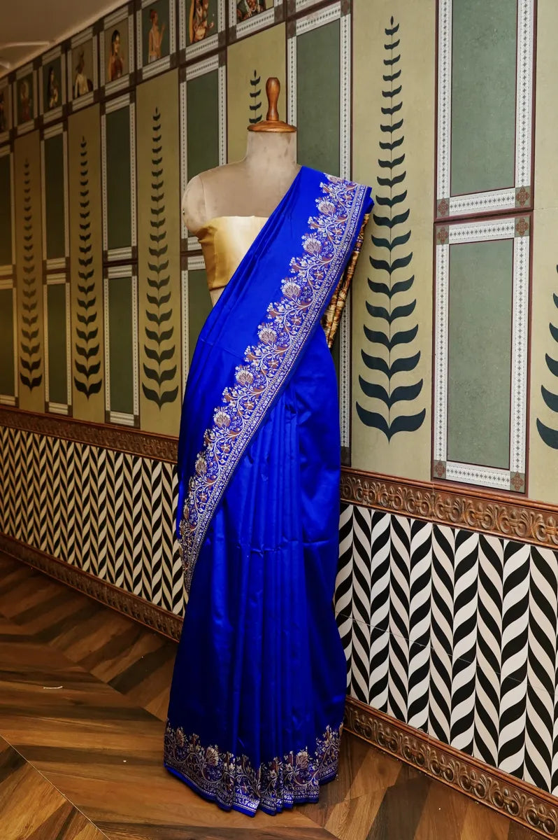 Saree Details : Saree Fabric : Pure Banarasi Single Katan Silk | Blouse Fabric : Pure Banarasi Single Katan Silk | Saree Work : Walkalam Design With Resham Work Plain Saree With Border | Blouse Work : Resham Booti Heavy Blouse | Saree Color : Royal Blue | Blouse Color : Royal Blue